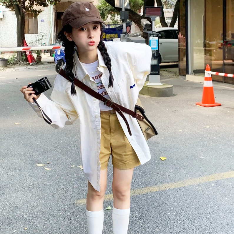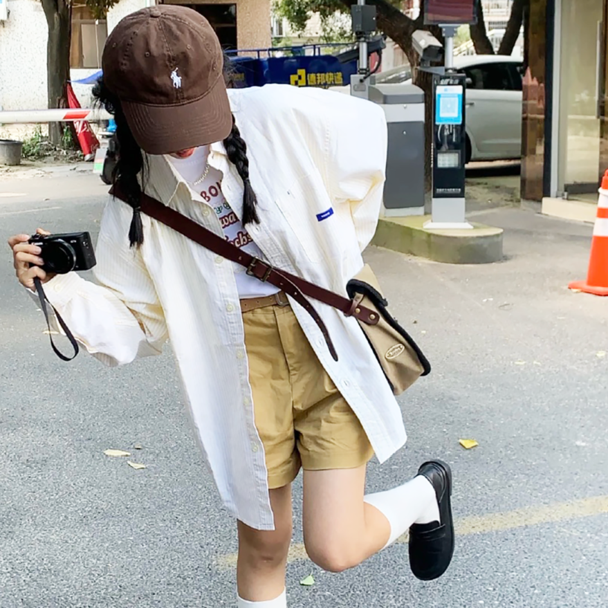 因為大面積灰色穿搭會有沉悶感,所以不妨用白色襯衫去提亮一下,面料上選擇偏硬的材質,會更顯休閒俏皮哦~