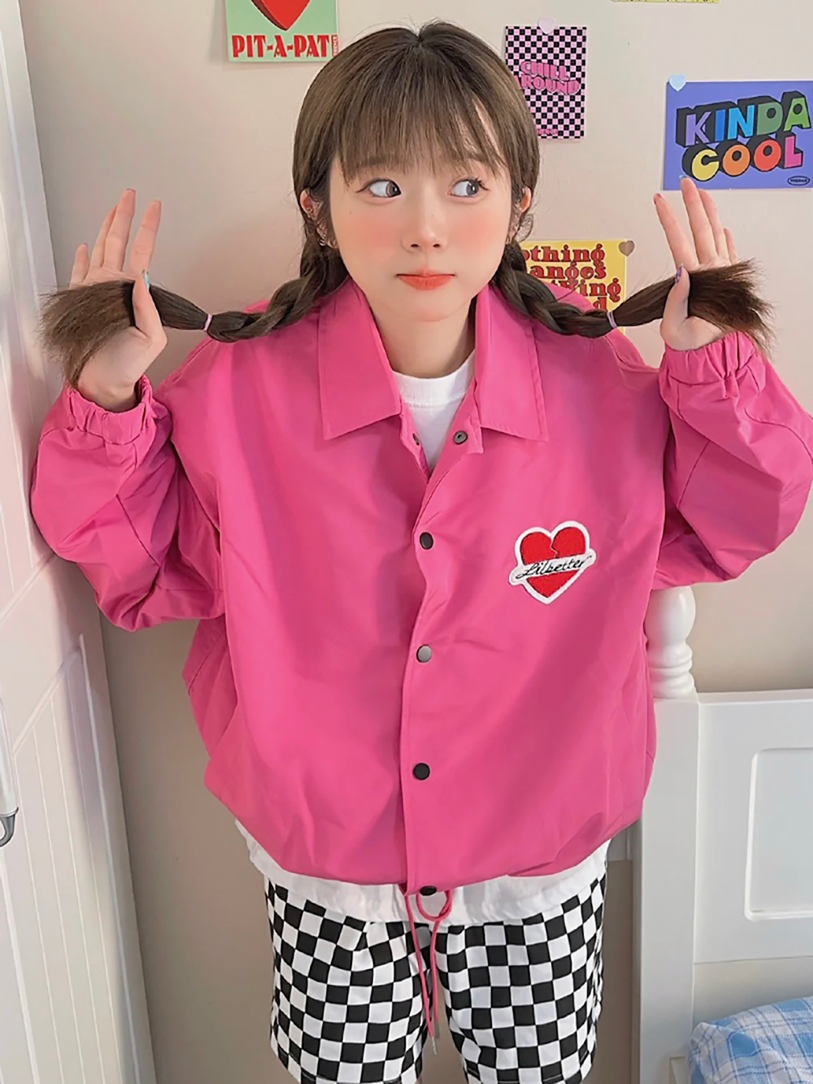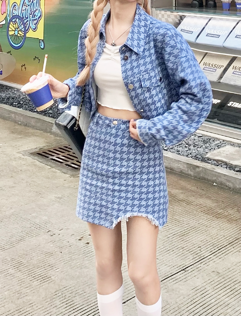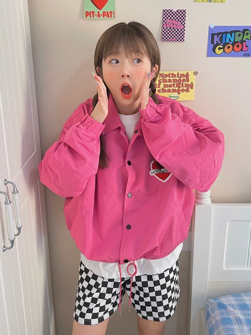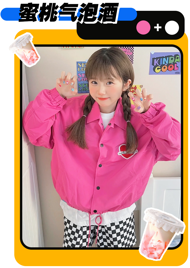 像這一件外套就用了明度較高的粉色,給人活潑清新的感覺,害怕hold不住的話,就用黑色格紋裙壓一壓~早秋甜酷少女就是你本人!