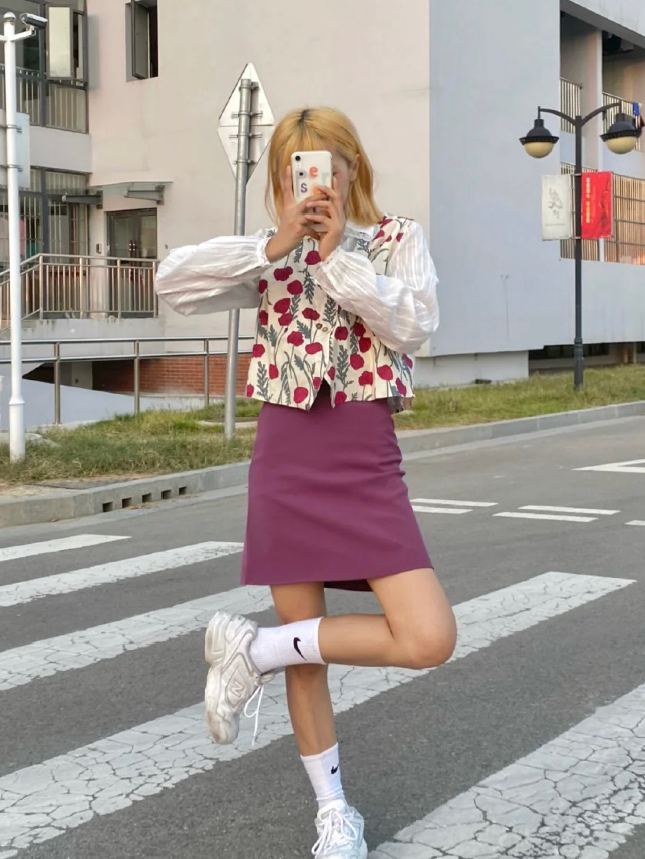 下半身再搭配一條深紫色的短裙,用上淺下深提高層次感,甜而不膩的一套穿搭就完成啦!