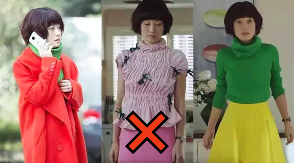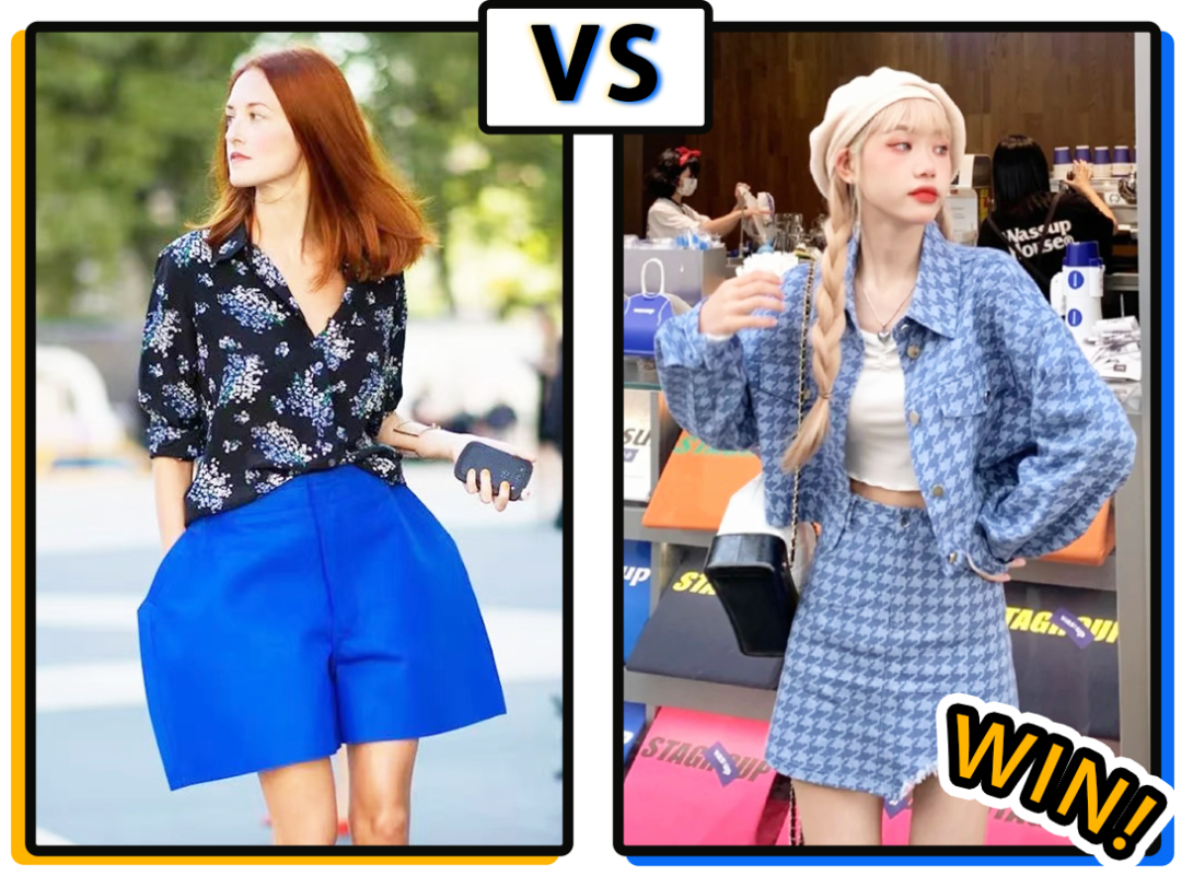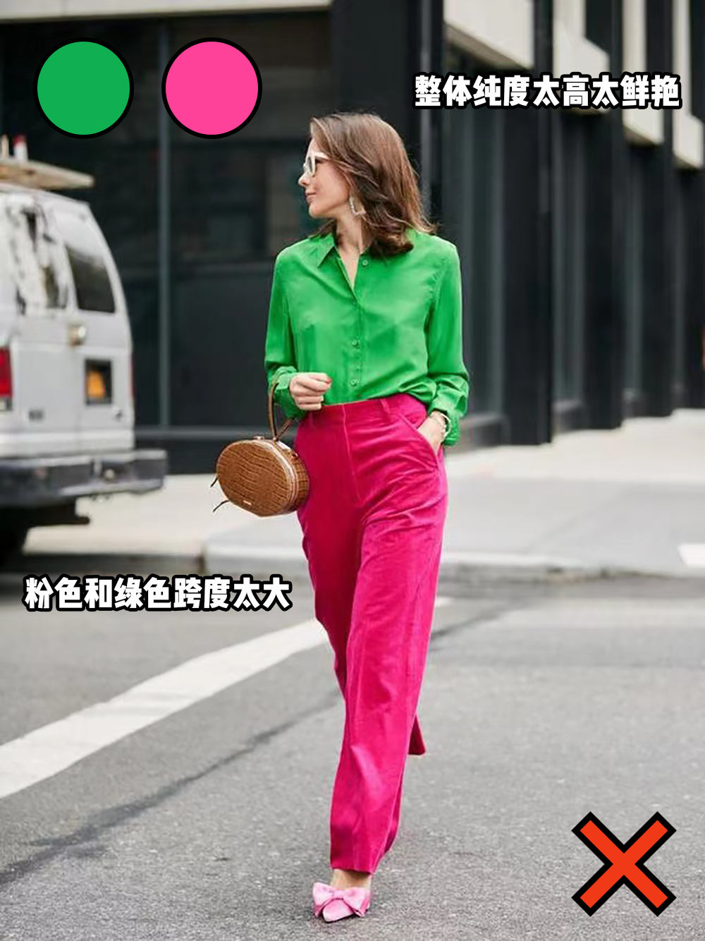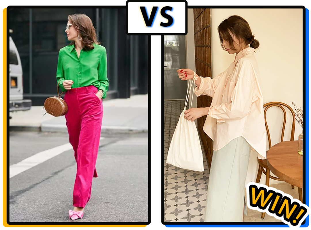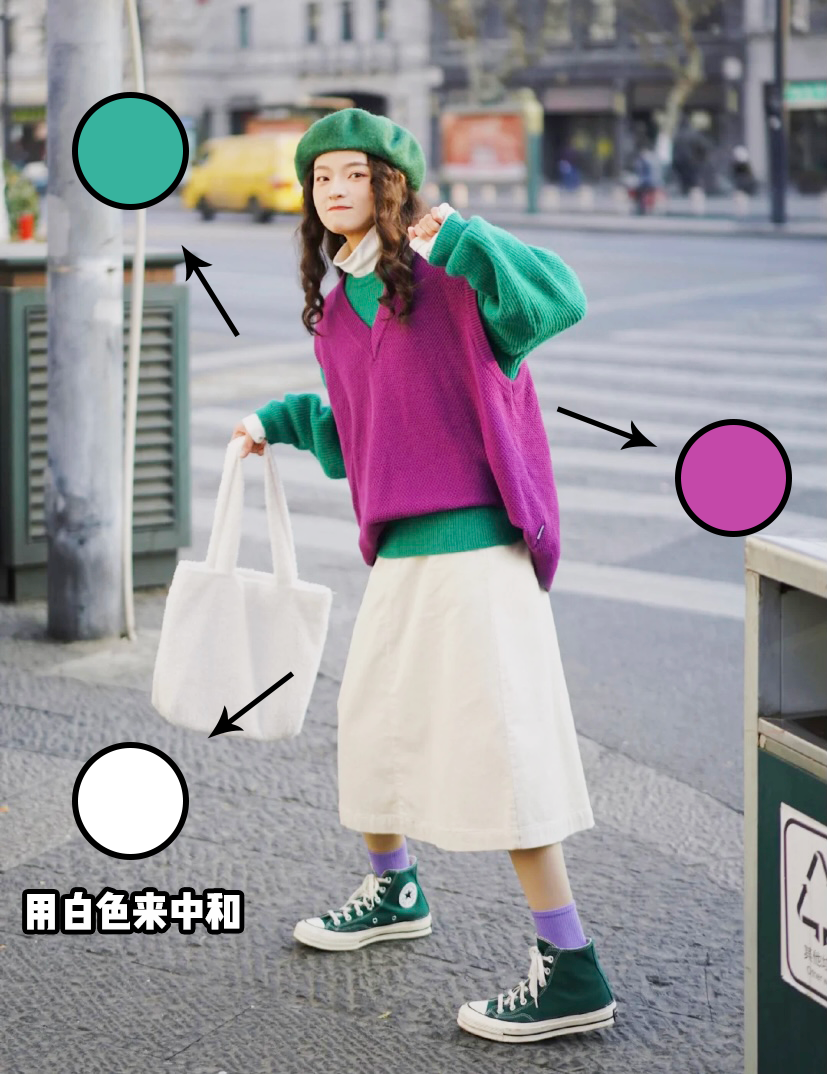 發現沒有,反例的女生其實是在顏色的比例上出了大錯!雖然都是撞色,但是左邊的配色明顯比較難駕馭,駕馭不好的話,不僅不時髦,還會有點農貿市場的味道!!so,經過我不斷地踩雷試錯,終於總結出了兩個原因!▼
