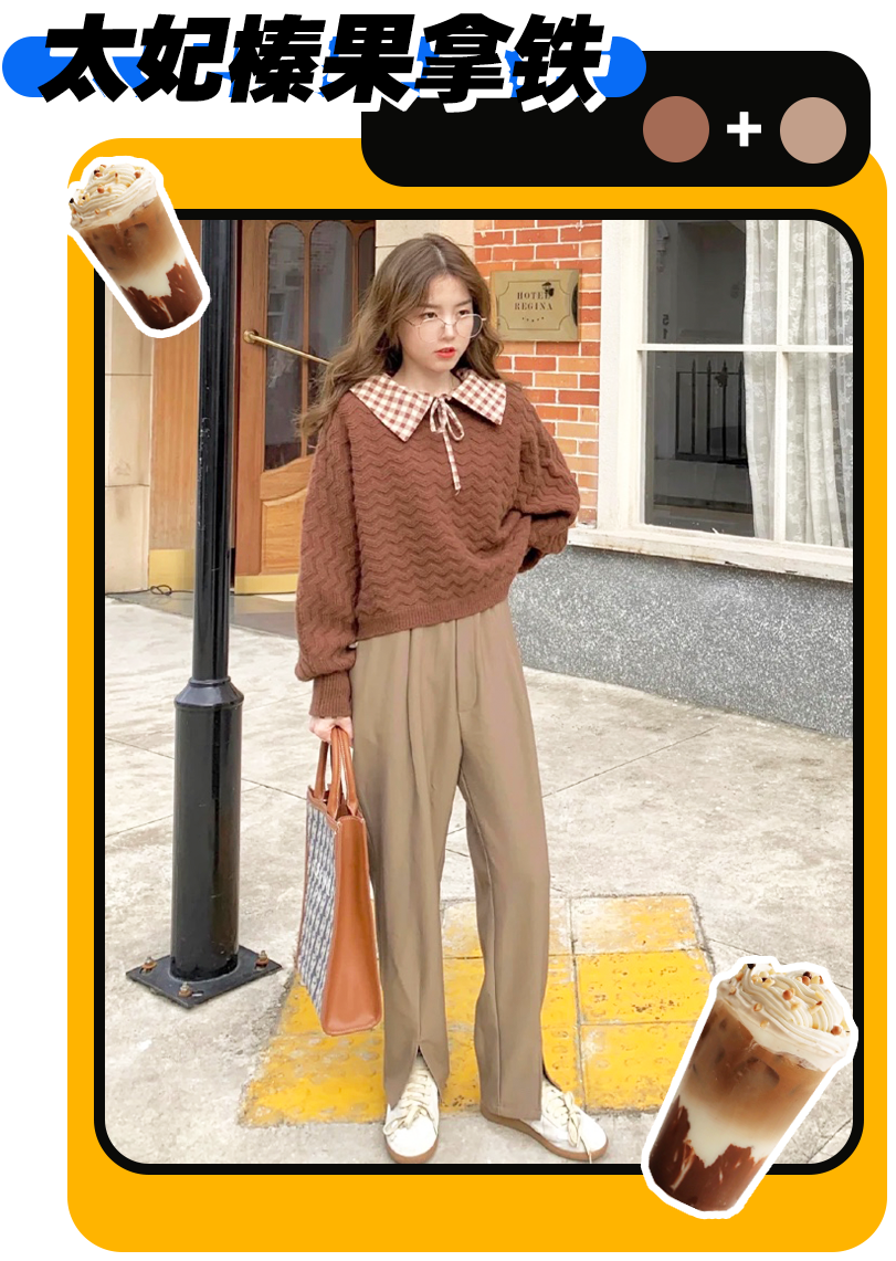 冰淇淋奶茶的關鍵字是奶棕色,配色溫柔不甜膩,用作穿衣參考也是滿分操作~