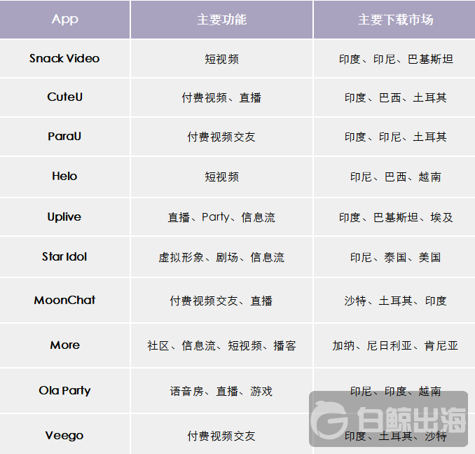 雖然有 10 款 App 上榜,但其實仔細觀察 Top10 中有 Snack Video、ParaU、Helo、Uplive、Ola Party、Veego 等 6 款 App 都是我們的老朋友了。感興趣的朋友們可以閱讀文章最下方的相關鏈接,查看白鯨出海的同學們過往對這些產品的分析和觀察。