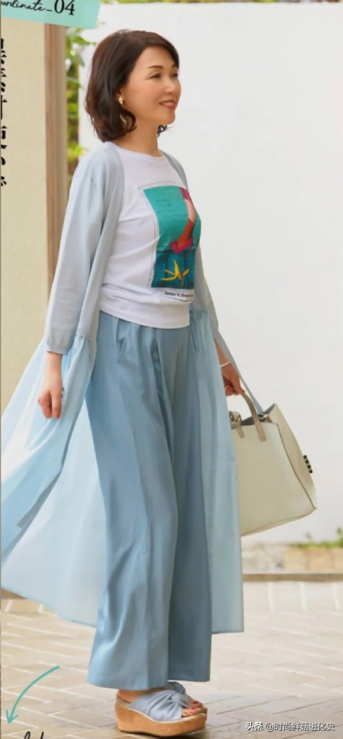 中年女性選擇服飾的材質不同,穿出的風格也會大不一樣。這款白色T恤的配色比較豐富,在白色的衣身上設計有綠色以及紅色的印花圖案作為裝飾,是整件T恤的設計重點。搭配淺藍色的薄紗闊腿褲來穿,寬鬆的褲型對中年女性的腿部線條具有不錯的修飾作用,遮肉顯瘦不挑身材。
