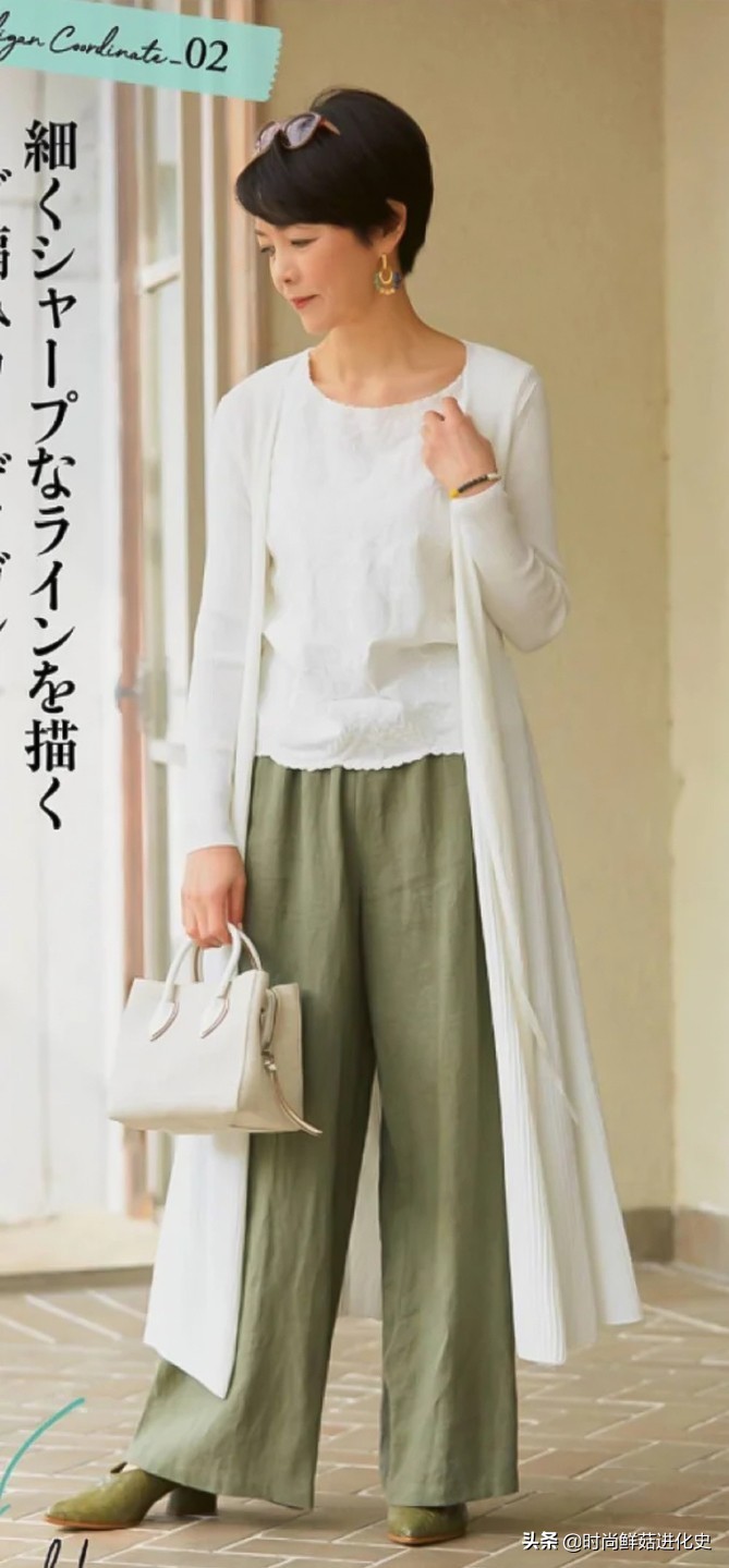 這款白色棉麻衫搭配綠色直筒褲的穿搭中性幹練,白色棉麻衫採用了天然的棉麻面料,穿著舒適柔軟,透氣性很高。搭配綠色的直筒褲,褲長設計在腳踝以下,巧妙拉長了中年女性的腿部線條,讓雙腿看起來筆直又修長。