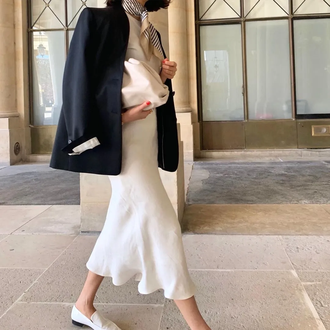 襯衫穿搭時,不一定要全部紮進去,像Doris這樣,搭配貼身一點的真絲或緞面裙,慵懶又有女生味,而且也很修飾身形。▼