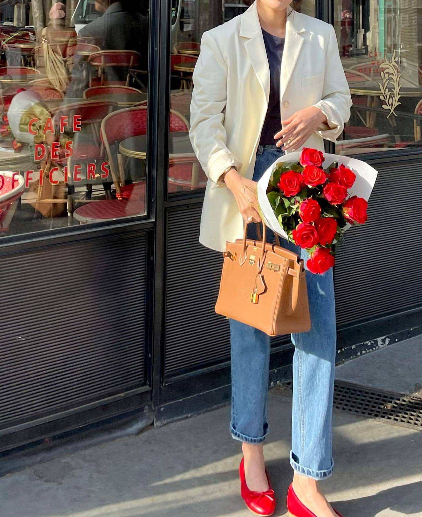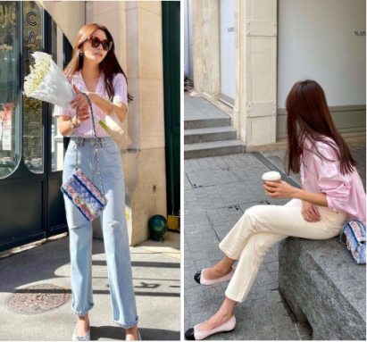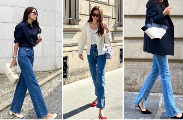 除了襯衫,還有一個便是法式風穿搭必不可少的牛仔褲。闊腿褲、直筒、開衩牛仔褲都是凹造型的必備。她的這三種搭配也很時髦,同色系、紅色點綴、黑金高跟鞋,每一身都至少有一個亮點。▼