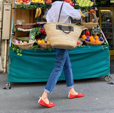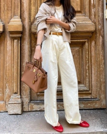 她尤其喜愛用紅色芭蕾舞鞋。T恤與闊腿褲的簡單搭配,加上一雙紅色芭蕾舞鞋瞬間就點亮了全身。尤其是當這種寬口闊腿褲長度至腳面,用一雙露出腳面的鞋子可以化解褲裝的笨重感,顯得更清爽。▼