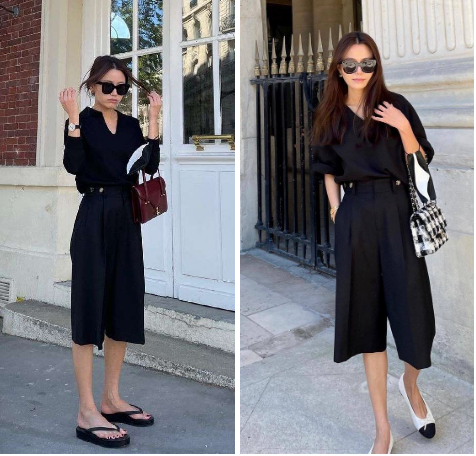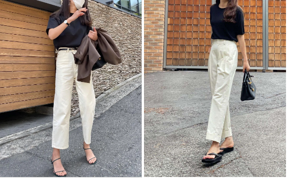 有時候換一雙鞋子就能脫穎而出。看這一組對比就能明白,左邊稍休閒,右邊就要優雅許多。