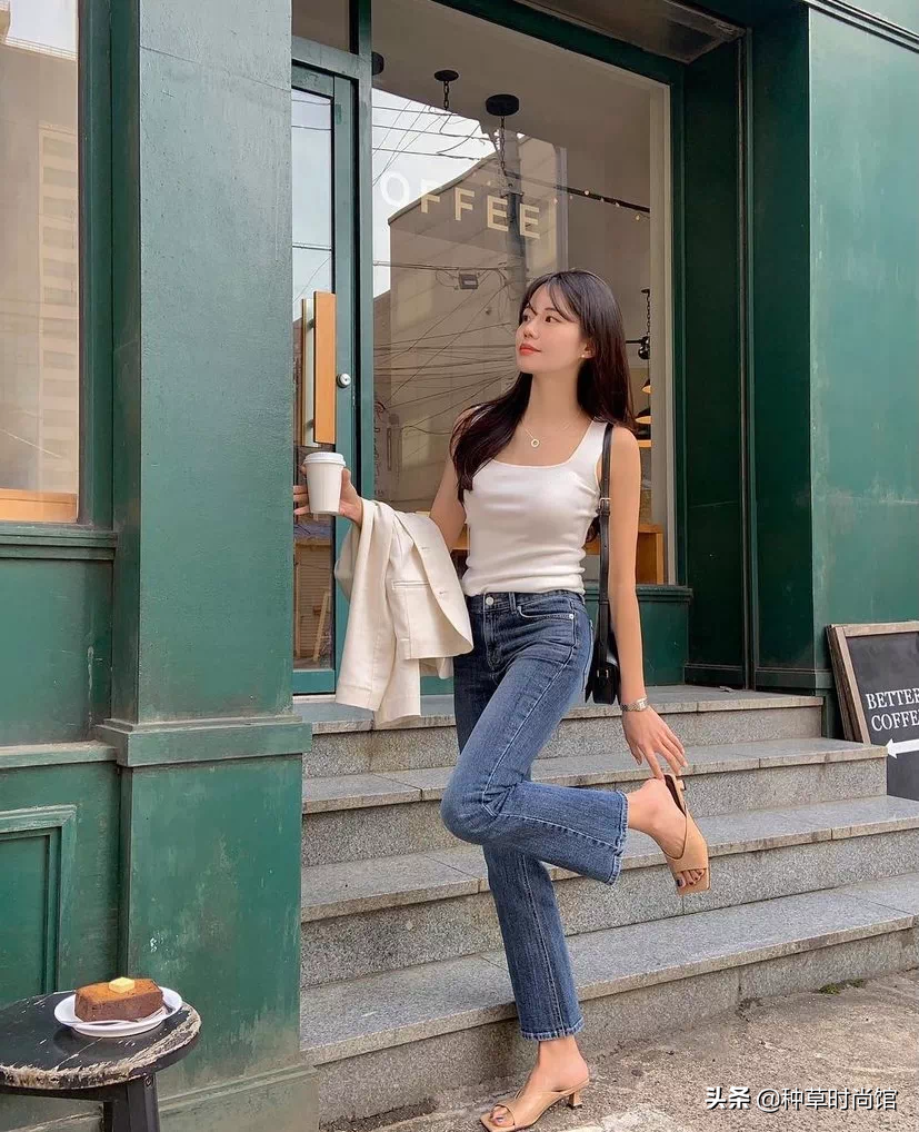 粒粒給她配了一套:黑色背心+高腰直筒褲。因為有肩寬困擾,背心要選擇粗肩帶,可以視覺上減弱寬度。