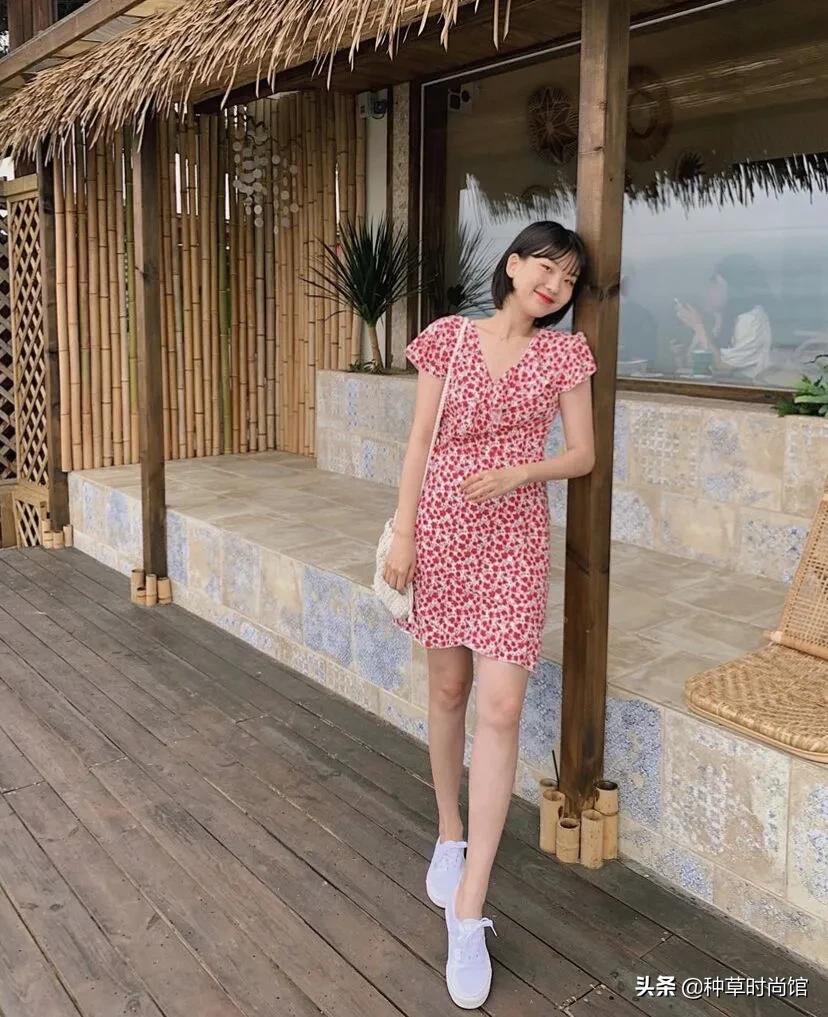 同理情況下,還可以選擇紅色小碎花。很適合出行遊玩、或者是約會。小白鞋和包包顏色相呼應,也是look的點睛之筆。