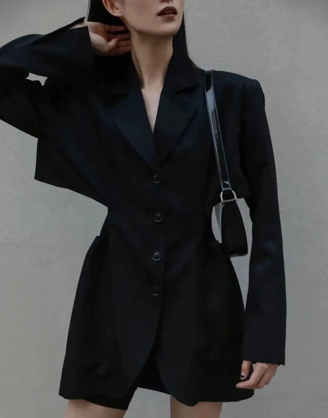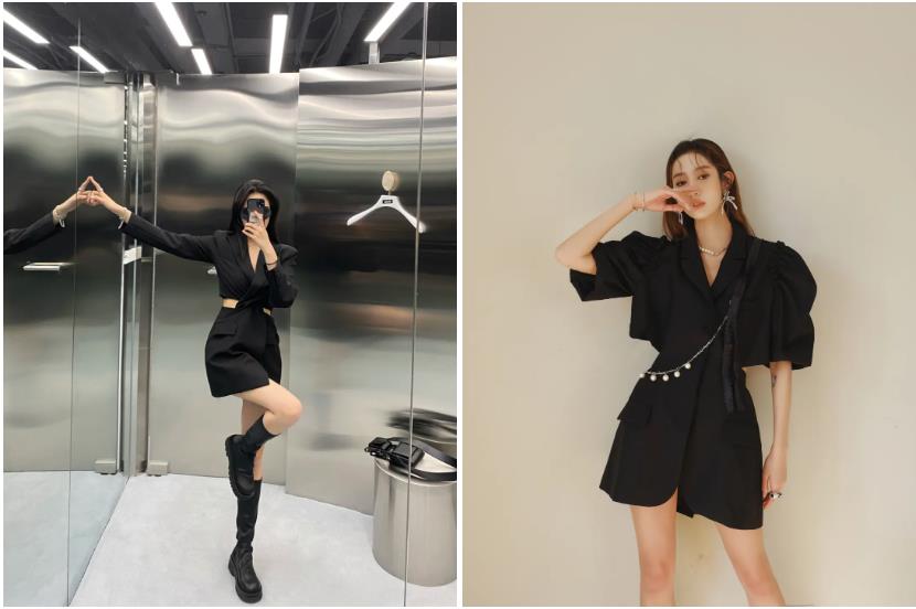 西裝裙的墊肩也是一個絕佳的修飾設計,對於那種肩膀圓的姐妹穿帶點小墊肩的西裝不要太好看,不僅憑空給你捏了直角肩,增加肩寬也能巨顯頭小