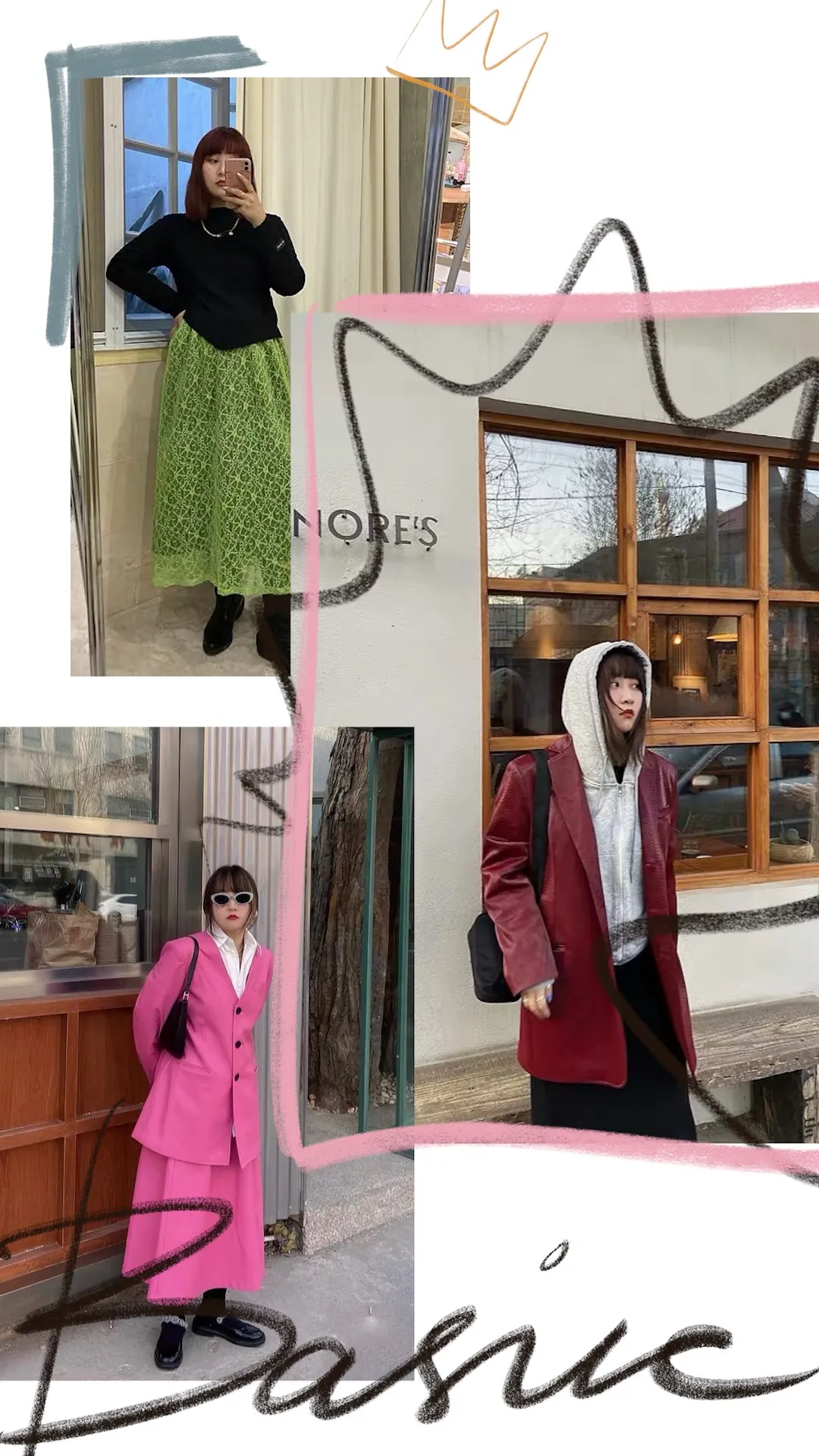 偶爾的幾抹亮色:玫粉、嫩綠、深紅在黑白色裡著實顯眼,疊穿缺一不可。