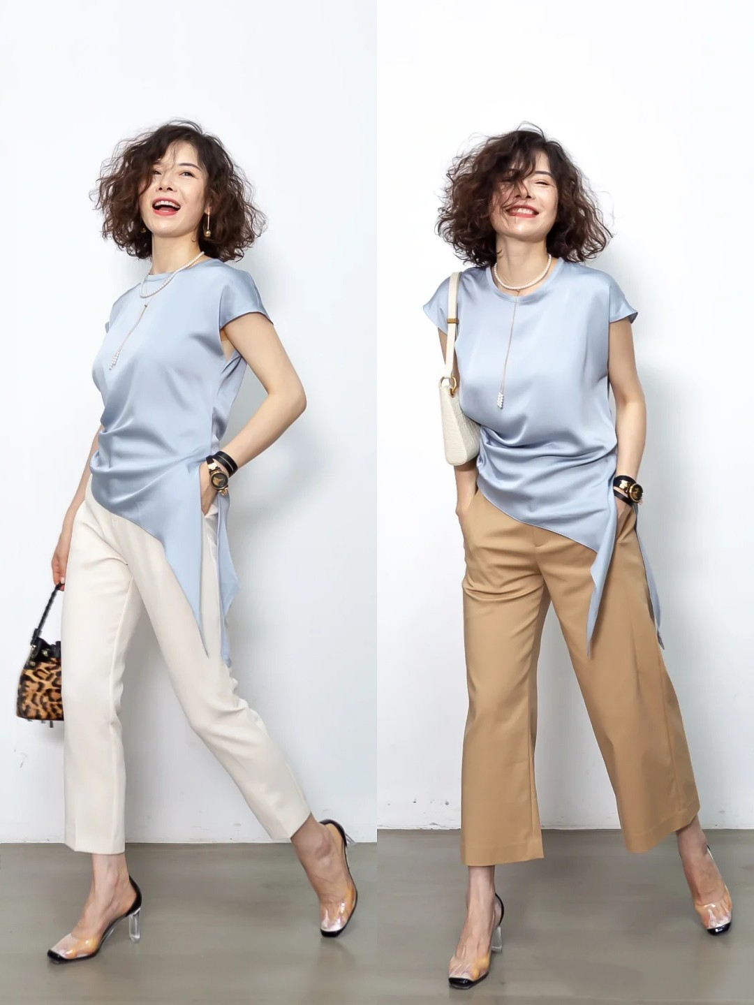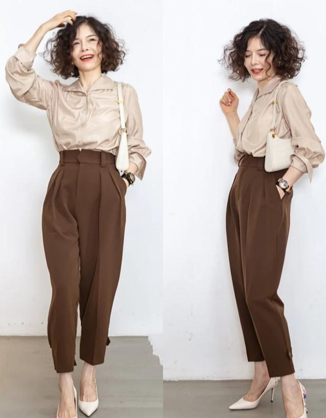 像這身造型,米色襯衣搭配咖色九分褲,雖然同為一個色系,卻因為深淺的不同,並不會覺得單一,反而帶來精緻幹練的美感。襯衣塞進長褲中,立刻顯出苗條的身姿,盈盈小腰又能讓女生味倍增。