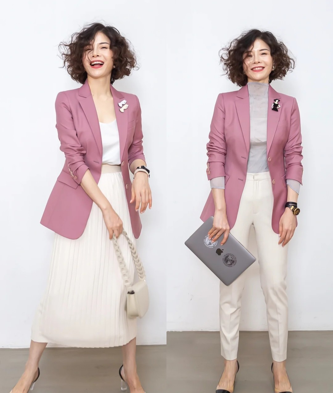中年女性在選擇粉色單品的時候,應該避免帶有熒光粉和芭比粉,有一些灰色音調的粉色,不僅女生味十足,也很減齡。像這件粉紫色的西裝外套,版型簡潔大方,無論是搭配長褲還是半身裙,都能演繹出又時尚又帥氣的風采。