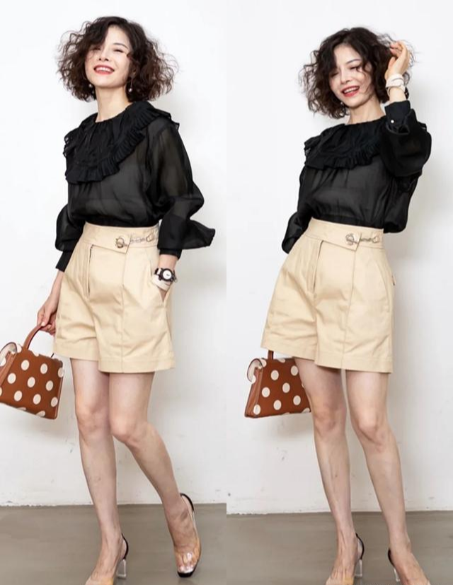 淺駝色的短褲與黑色襯衫相組合,深淺的對比,畫面感更強烈,上下身的比例也會更加清晰。這款黑色的襯衫採用透視的面料,若隱若現中增添幾分朦朧的韻味,在紅唇的襯托下,女生味十足。