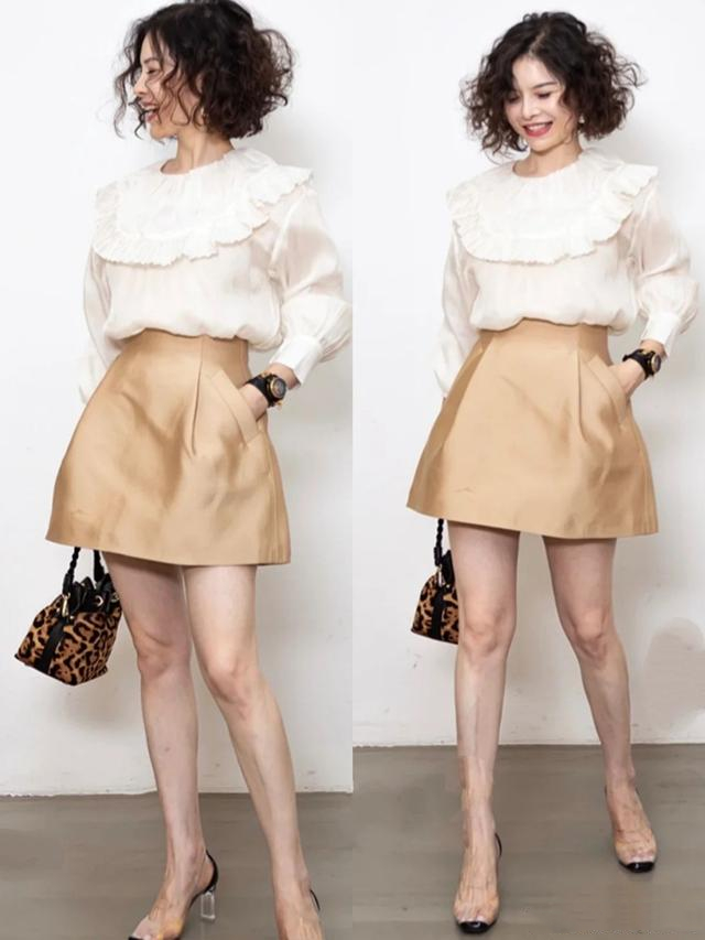 這款A字形的小短裙,對於腿型好看的姐姐特別友好,在蓬松造型的對比下,顯得腿型更加纖細。上面搭配一件白色襯衫,套頭的樣式,加入層疊的花邊溫柔嫵媚又減齡。小短裙上加入口袋的設計,不僅別致,而且實用性也很強。