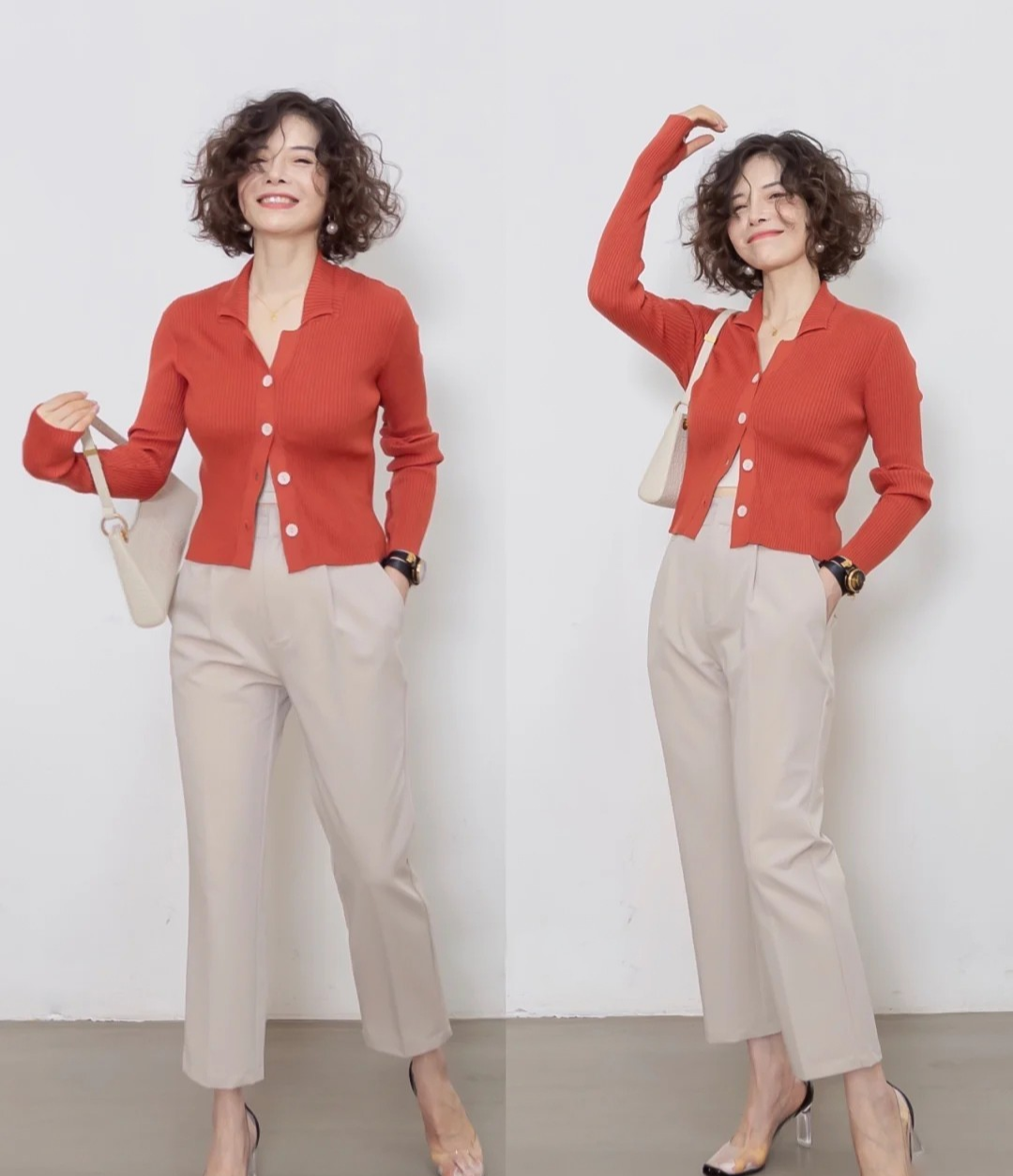像這身造型,運用磚紅色的針織衫搭配米色九分褲,溫暖的色調,立刻點亮心情。淺色的長褲襯托得紅色針織衫更加明艷,針織衫屬於短小精緻的類型,解開下面兩顆扣子的穿法,也能有效地拉長下半身的長度,腳踩一雙水晶高跟鞋,顯高顯瘦顯氣質。