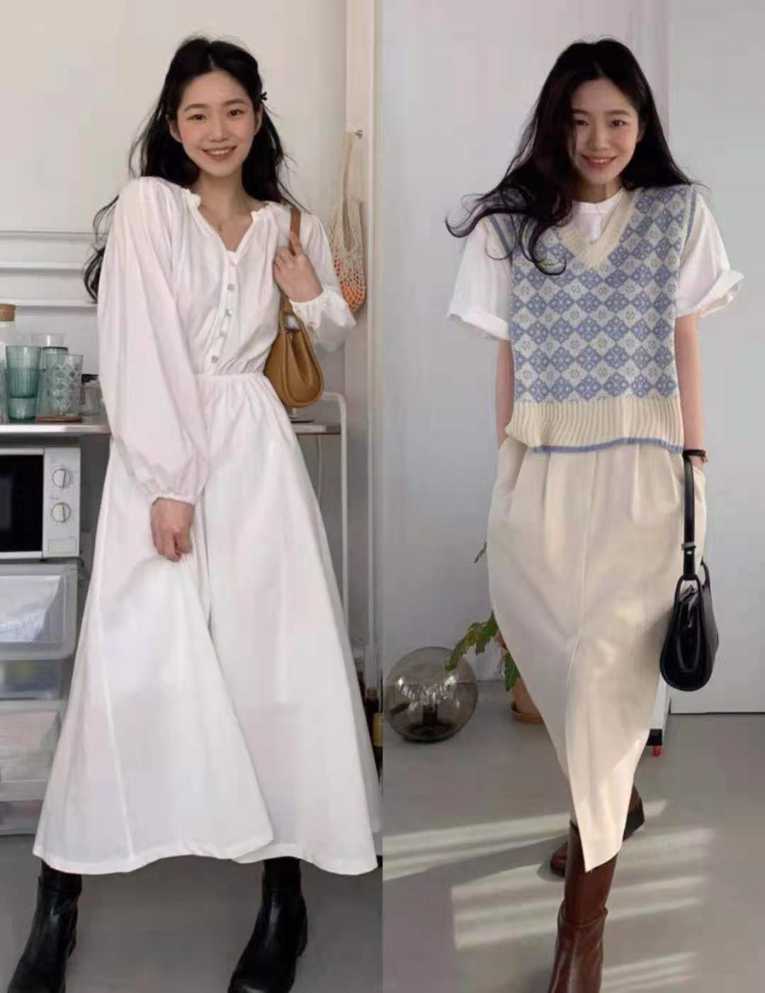 白色的連衣裙搭配黑系的高腰皮鞋也太顯氣質了吧,適合高個子的妹妹們穿搭,給我們帶來鄰家小妹妹的可愛感。與前者較為相似,這身同款的藍色馬甲搭配米黃色的半身裙,也能穿出了一種嫩嫩的清新感。