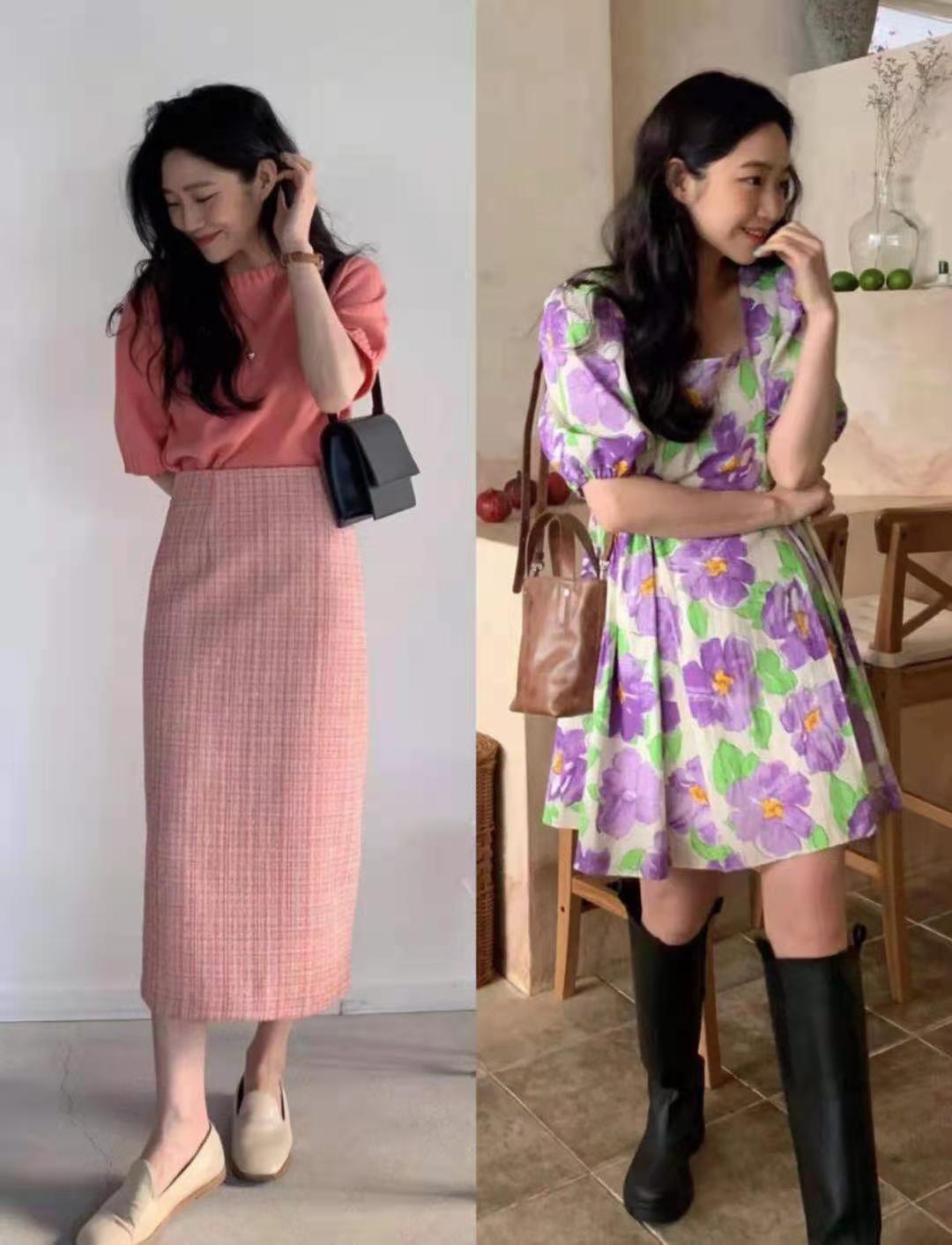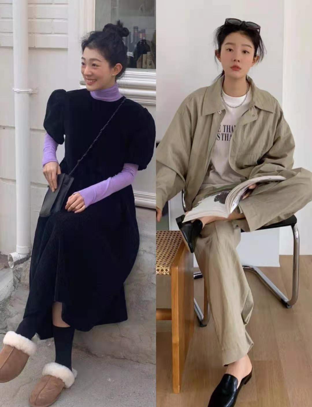 韓系的咖色西服套裝真的超有質感。經典的韓系襯衫外套與黑色的皮鞋搭配起來秒變慵懶休閒少女,真的很適合初秋穿搭啦!黑色的泡泡袖連衣裙搭配紫色的內衣單品,小個子穿起來剛剛好。