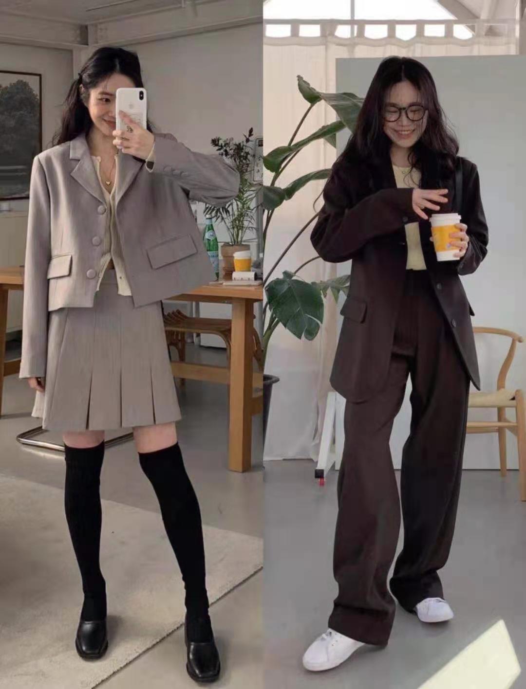 這兩身西服樣式的韓系服裝,顏色也太正了。灰色的小西服上衣與百褶裙和黑色皮鞋絲襪的搭配也太大膽了,但整體帶給我們的感覺依然不失絲毫的俏皮可愛感和經典正式格調。相比起來,另一身純黑色的西服套裝就顯得整體更加乾淨利落了。
