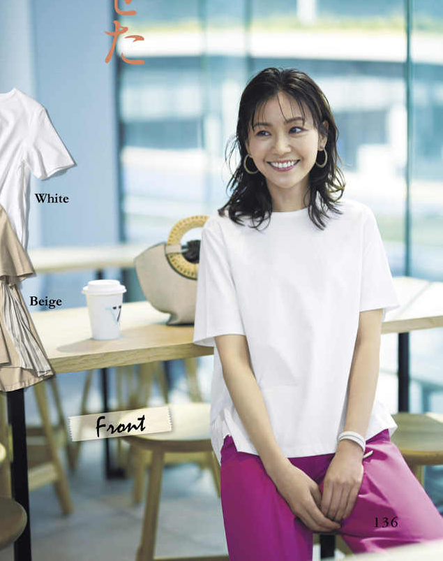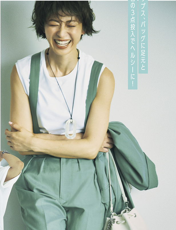就像圖中這一套,搭配上半身是非常簡約的白色針織衫,而配合了一條比較亮眼的彩色珍珠項鏈,圓潤的項鏈和女性戒指完美融合,展現出溫潤如玉的感覺。