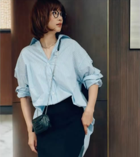 這件藍色襯衫,有著足夠活泛的寬鬆度,落肩袖明顯,版型適當寬鬆,雖長但可以靈活調整,不失為減齡輕鬆的好看襯衫典范。