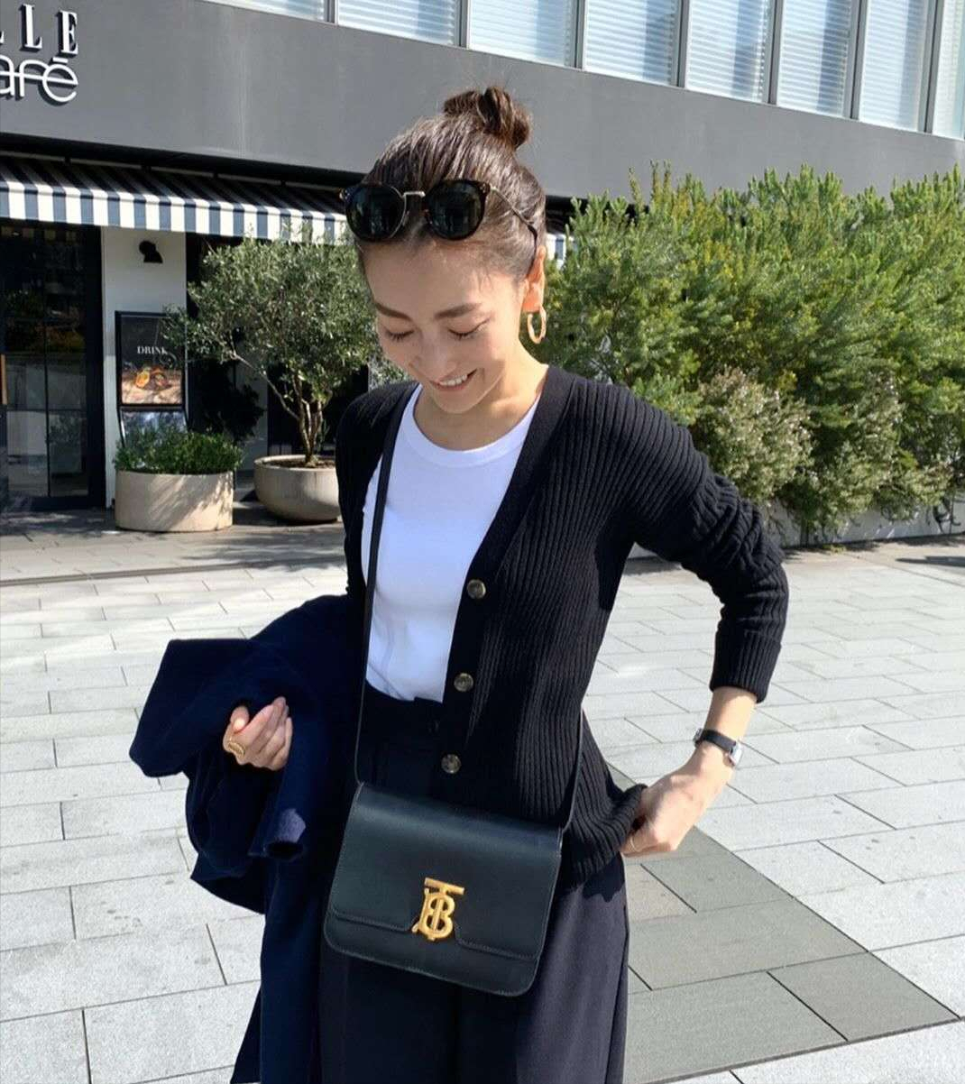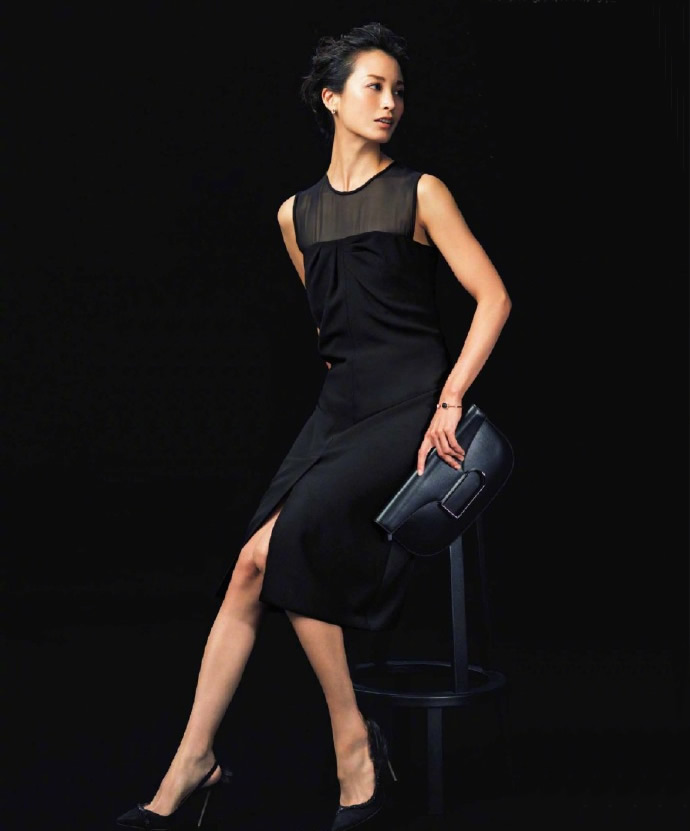 穿著時,搭配正式風的高跟鞋與精緻包包,一身黑卻颯美有型。