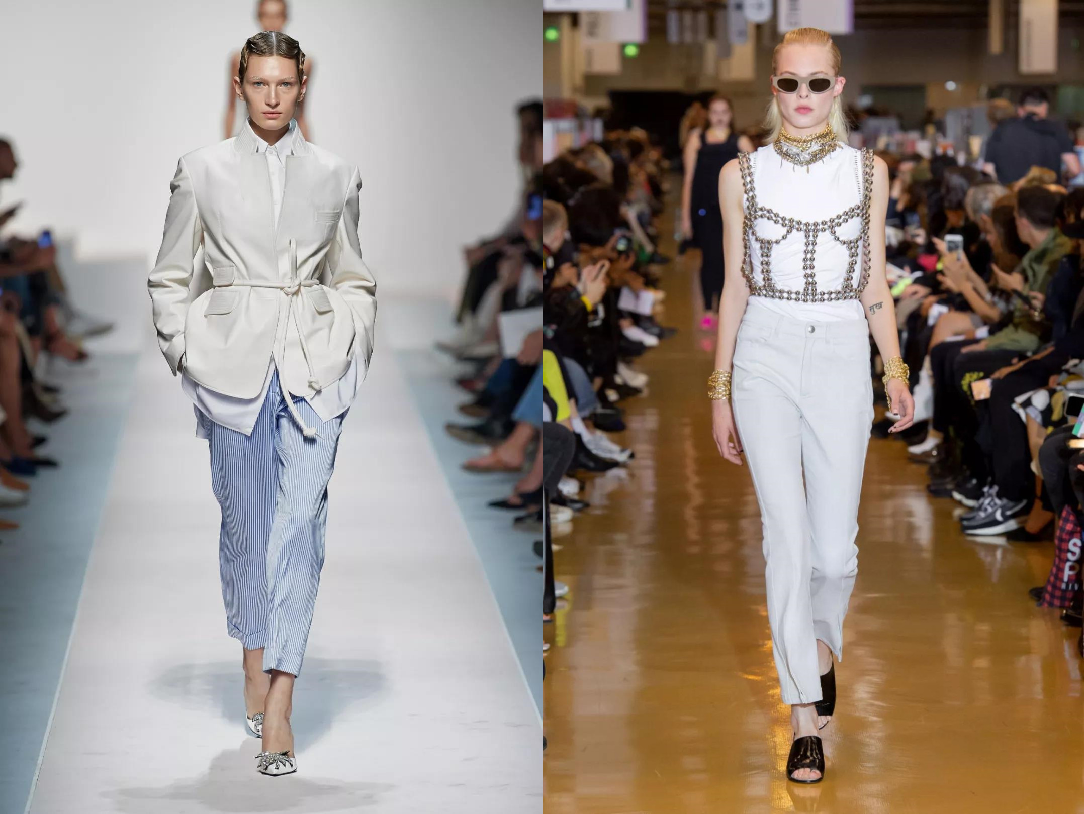 下圖中白色褲子腰部的褶線明顯,它們呈斜線左右排列,形成修飾小腹的有力屏障。