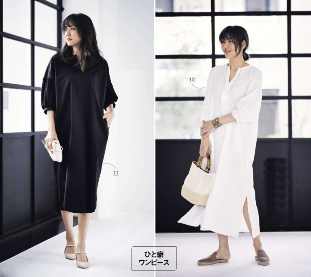 寬鬆的襯衫裙,分別搭配尖頭高跟鞋與休閒鞋,一個精緻、一個休閒,對比分明。