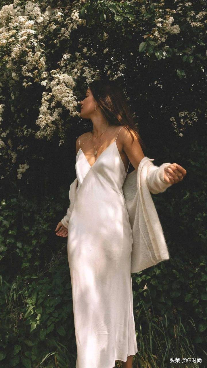 緞面材質的吊帶連衣裙,華麗又顯氣質,雖然有種睡衣風的性感氣質,但是搭配上外套,依然性感有架式,還提升了高級感。