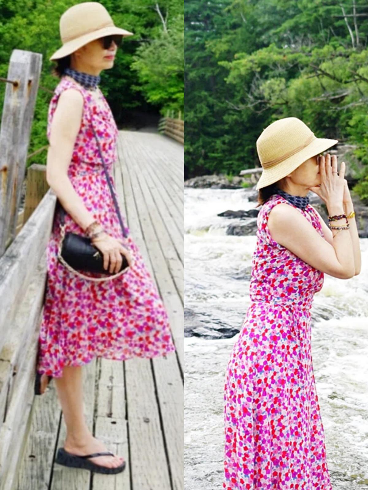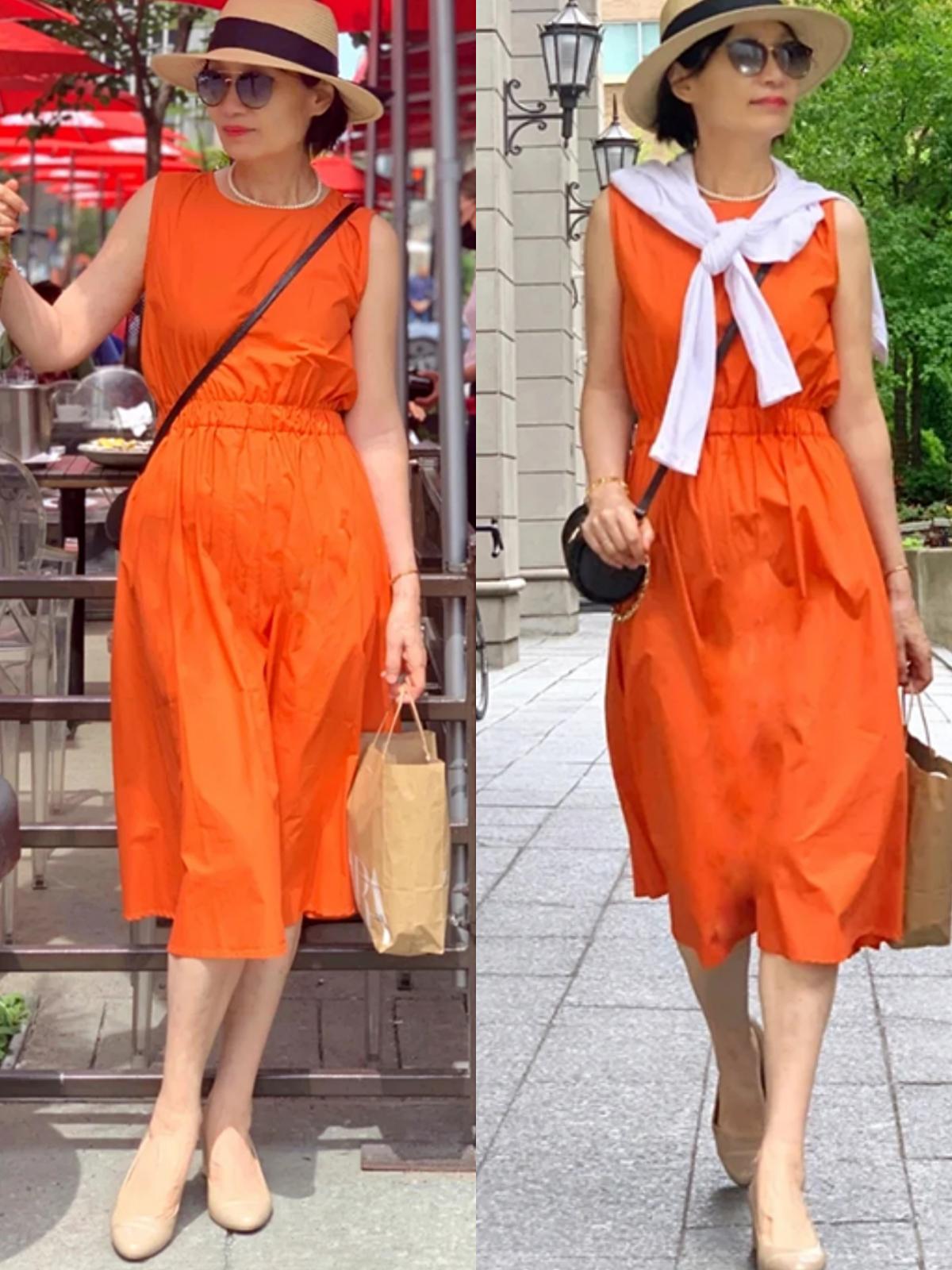 但用連衣裙來打造夏季出街造型時,這位63歲奶奶也會考慮裙裝顏色是否適合自己,以及款式得體與否。例如在顏色上,由於膚色比較白皙,她通常會選擇一些稍微明艷一點的裙裝款式,如紅色、橘色,更顯狀態年輕。