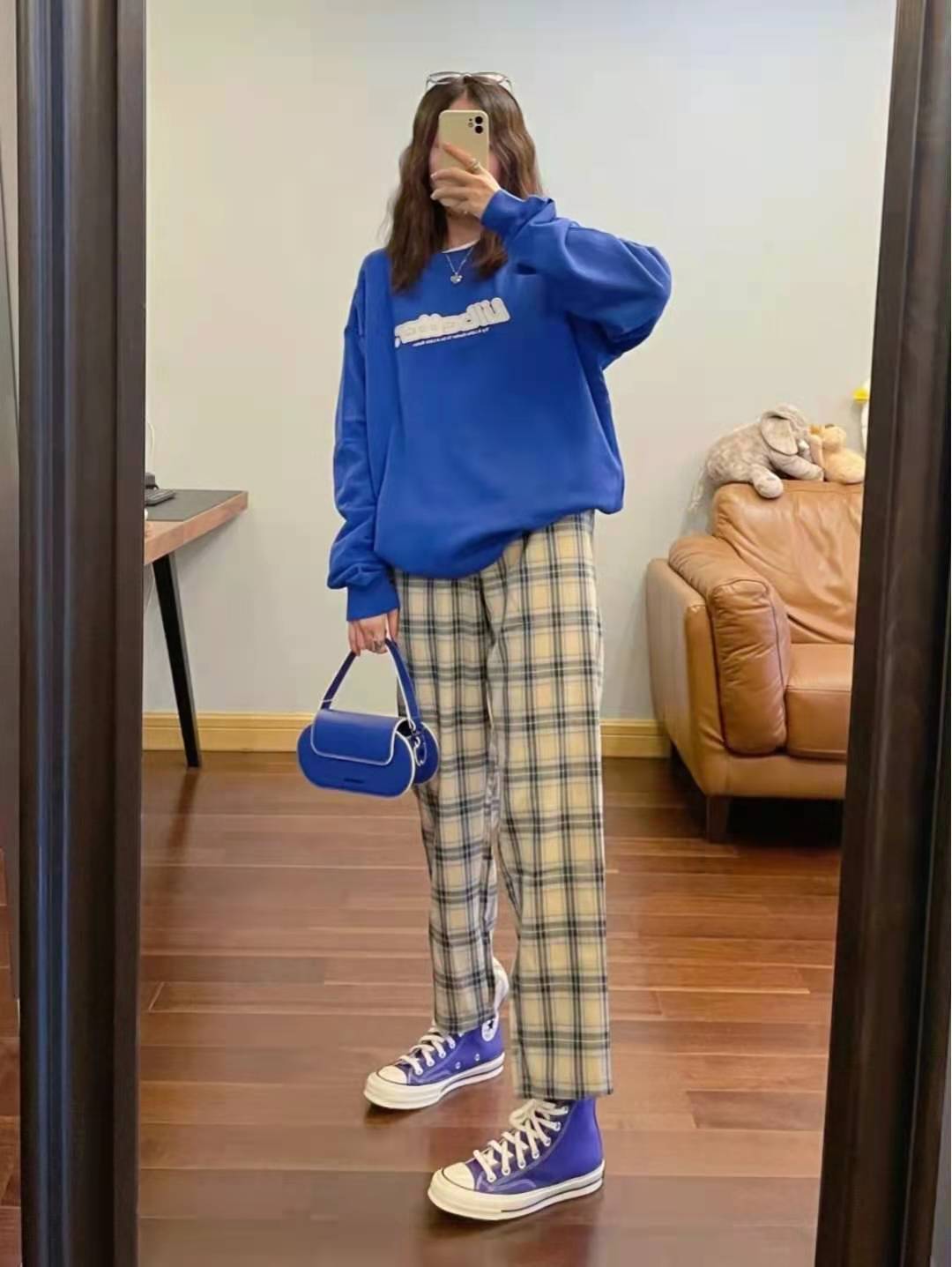 秋天穿搭:克萊因藍衛衣真的顯白,穿這樣松垮的衛衣又舒服又吸睛,下半身的格子褲松垮又垂墜,有點酷酷的,早秋配衛衣剛剛好,一點點學院風。