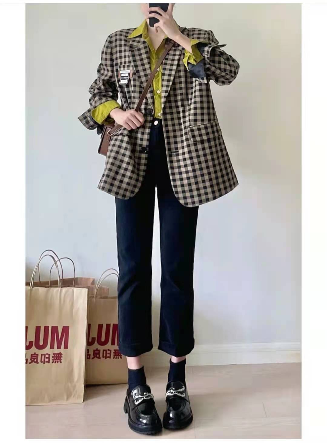 秋天穿搭:這件格紋西裝真的很復古,很有特色的一件外套,寬鬆版型肩寬很大,內搭了牛油果綠的襯衫提亮整體look,下半身搭配黑色小直筒九分褲褲修飾腿型很奈斯,腳上穿了黑色的漆面皮鞋,復古英倫風,搭配九分褲很好看。
