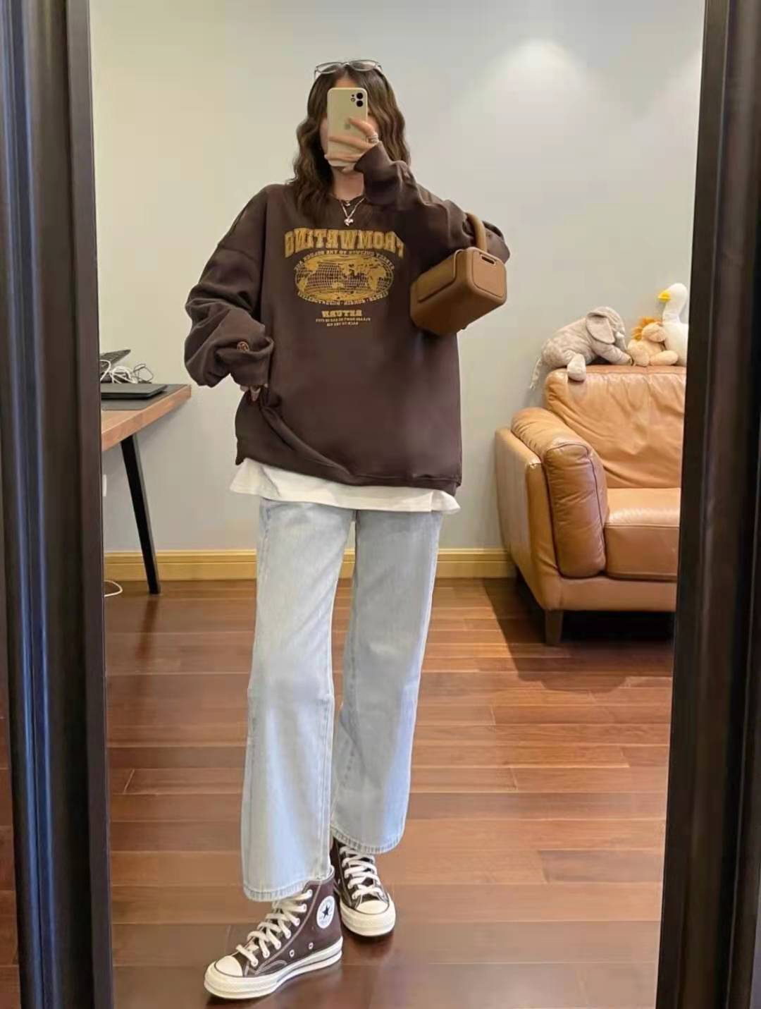look5 深灰咖色衛衣+內搭白色T恤+淺藍色直筒寬腿牛仔褲+高幫帆布鞋
