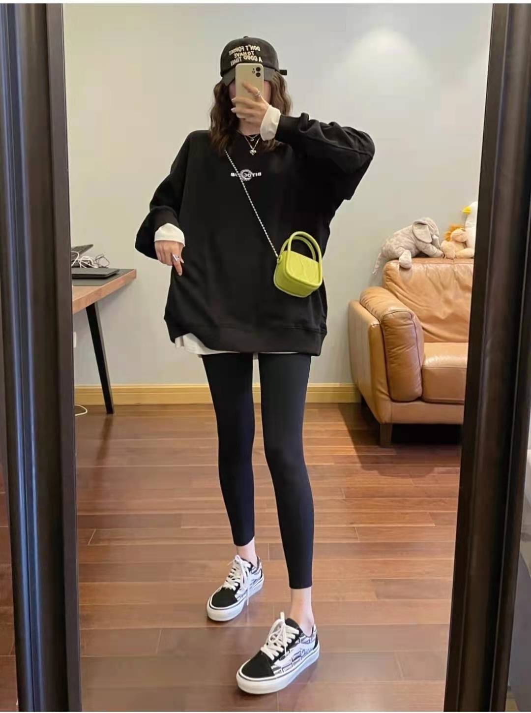 look6 黑色寬鬆衛衣+內搭白色T恤+黑色打底褲+范斯帆布鞋