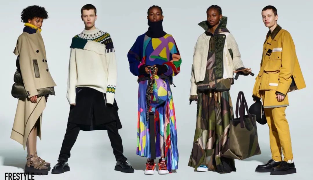 你想把藝術品穿在身上嗎?Sacai首次與潮流藝術家KAWS合作,以「可穿戴的藝術」為理念,將後者標誌性的色彩和圖案融入該系列服裝中。早在1965年,伊夫·聖·羅蘭(Yves Saint Laurent)就曾把荷蘭畫家蒙德裡安(Piet Mondrian)的畫作制成長裙,時尚與藝術的融合總是能誕生經典的作品。KAWS運用同一概念,將大膽撞色賦予每件單品獨特的趣味和藝術性。