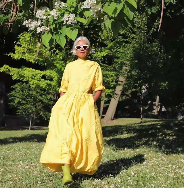 這張圖片只是看看都覺得心裡一片明媚。黃燦燦的連衣裙充滿了陽光,寬大的款式營造出瀟灑恣意的味道,恰到好處的收腰設計,打造完美的身材比例,上手插兜的她從草地款款走來,自由、浪漫又好看。