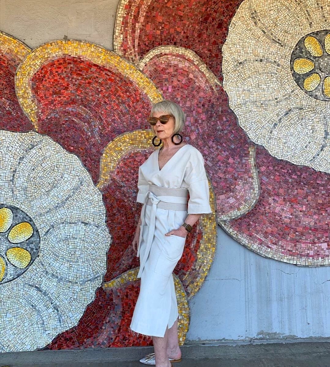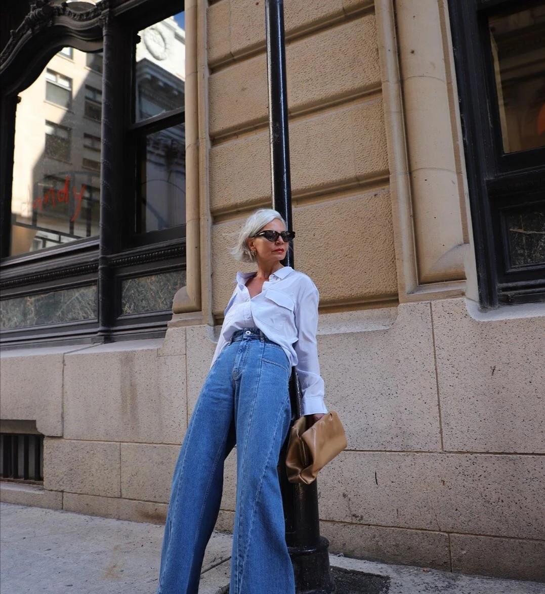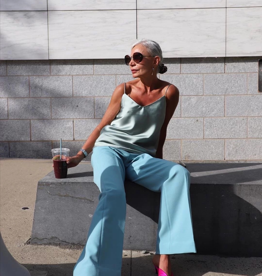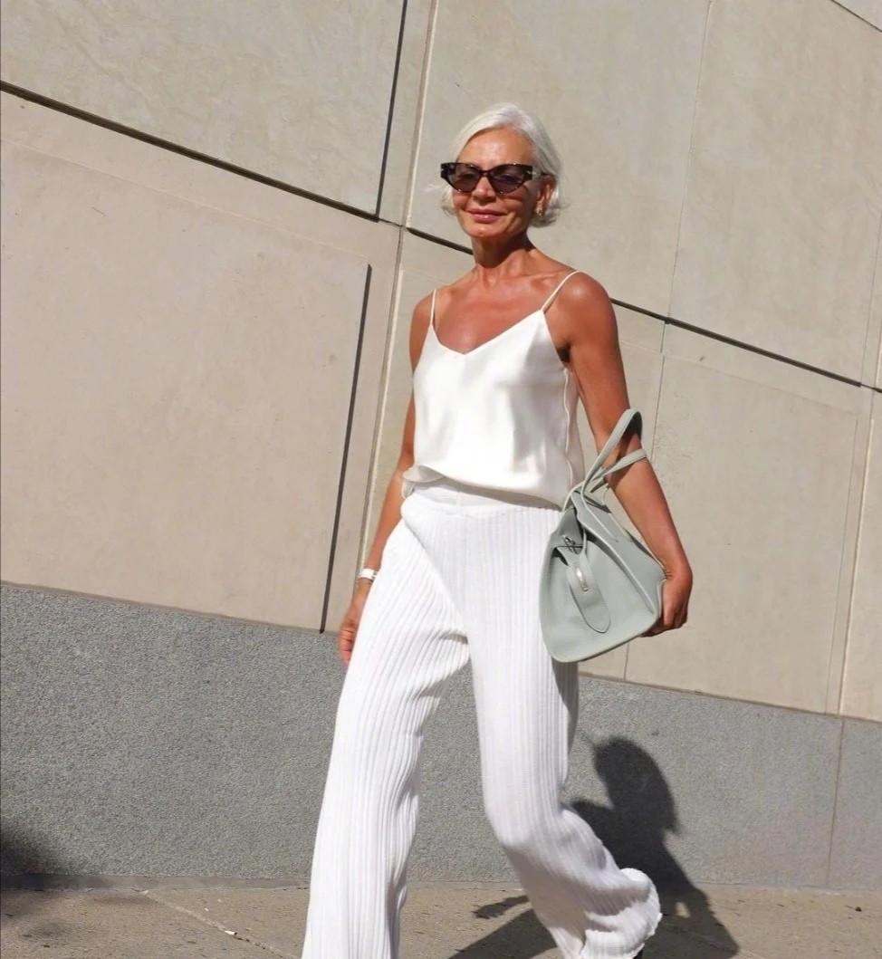 這位年過半百的博主運用到的是簡單的白色吊帶背心,她可以運用這種服裝,穿出十分簡潔利落的風格。在下半身配合一款同色褲裝,這種配色人人都能夠掌握,而且褲裝營造出對腿型的拉伸感,怎麼看都很洋氣時尚。
