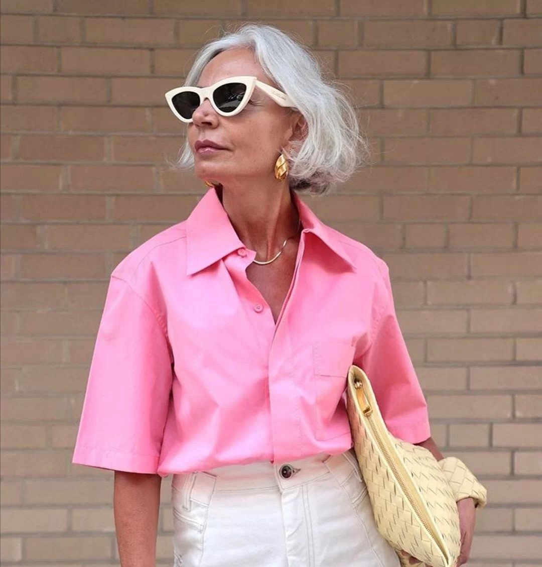 這位博主採用的是粉色的襯衫,這樣的色系即使年過半百,也能夠完全hold住,主要源於內心強大的自信和姿態的從容愜意。只有自己解放觀念,改變心態,才能把各種服裝都穿出迷人的風采。