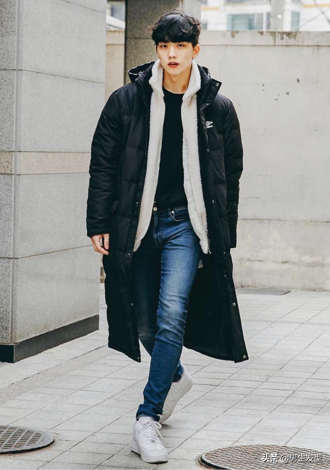 在北方的同學們,沒有一件大衣是出不了門的!因此,長款的羽絨服可以穿上一件,然後裡面再穿一件很保暖的毛絨開衫,就很有保暖的效果了!下身常規搭配牛仔褲以及白色板鞋,整個穿搭低調不花哨,也充滿帥氣的感覺!