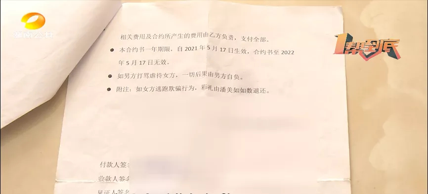 在婁底見面之後,經過幾天的相處雙方之間互生好感,然後簽署了一份現金收取書。由徐女士向媒人潘美如支付十一萬元的彩禮錢,並且雙方在合同上約定如女方逃跑欺騙,彩禮將由潘美如如數退還。