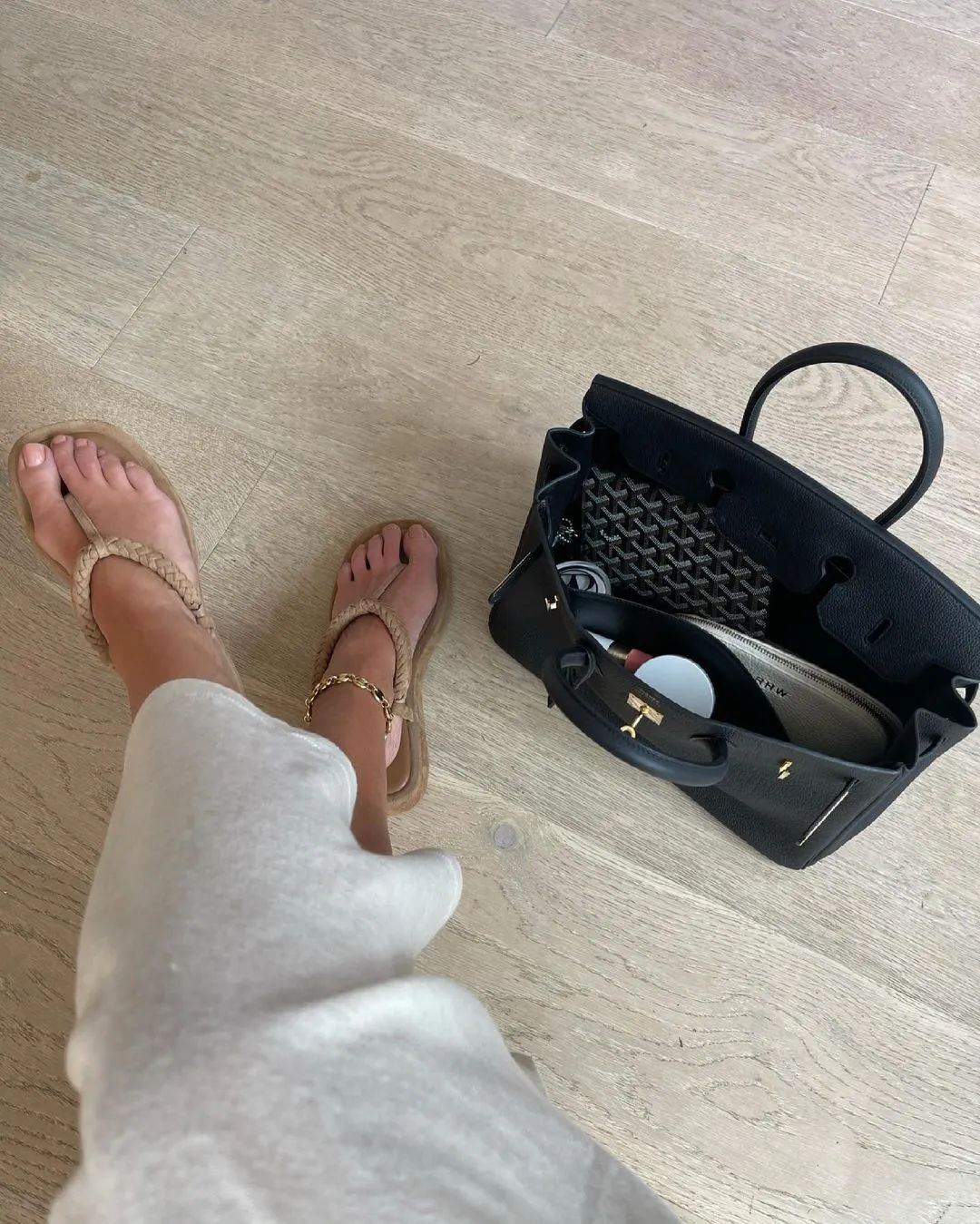 鞋子也選得好,是她跟Gia共同推出的聯名款,正好給自己帶貨了~當然還有一點,這雙平底涼鞋很符合機場穿搭的場景設定(紐約-倫敦的長途飛行),這也是最基本、但很多時尚穿搭裡會忽略的問題:合理性。