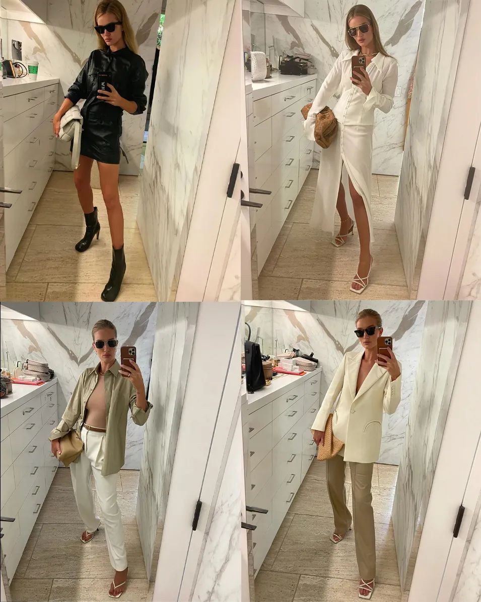 作為模特、女企業家,Rosie有很多場合會穿到禮服,但她也在「7 Days 7 Looks」裡分享了自己作為職場人,參加日間商務派對時會穿什麼。