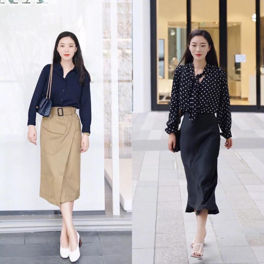 而卡其裙與黑色魚尾裙,風格略有不同,匹配各自襯衫正好吻合。相比而言,波點襯衫的搭配輕熟風明顯,把握不好度會顯老氣。