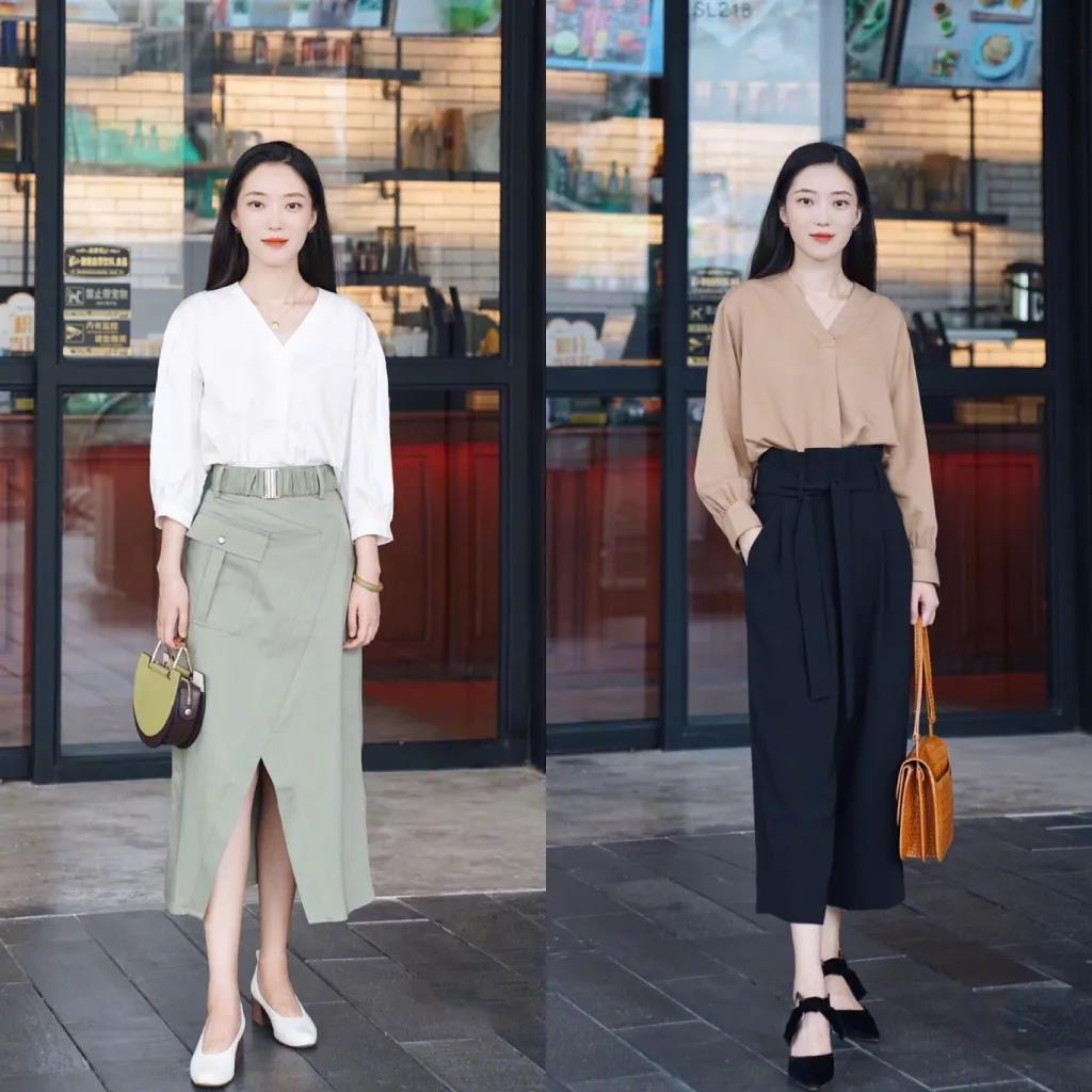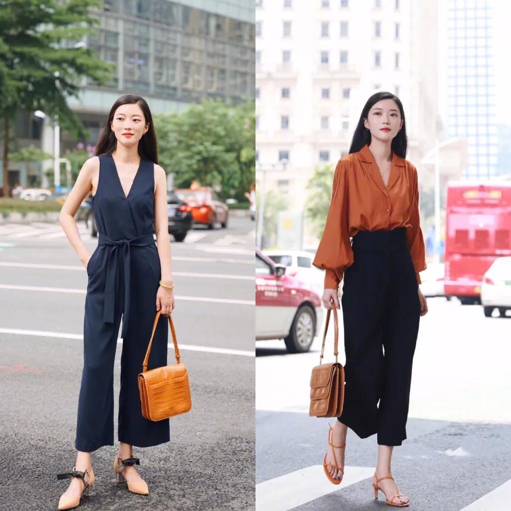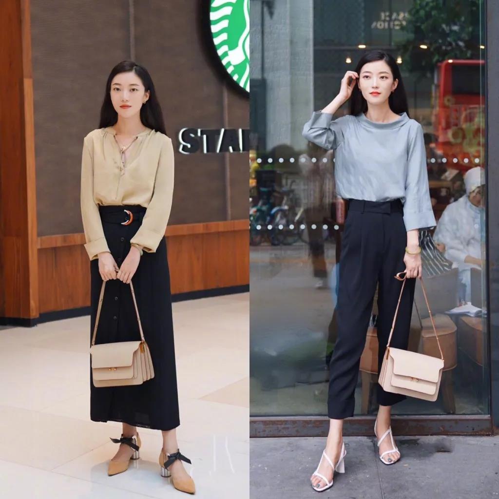 對比這2套搭配,褲裝的利落與半身裙的溫婉形成對比。不容忽視的鞋子與包包,起著至關重要的時髦調和作用。