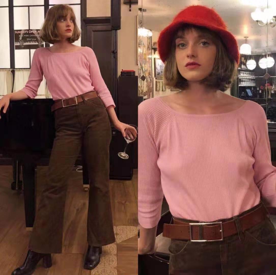 選擇淡淡的粉色打底衫搭配棕色系的闊腿褲,高腰的設計塑造出完美的身材比例,讓整個人看上去既柔和又高貴。