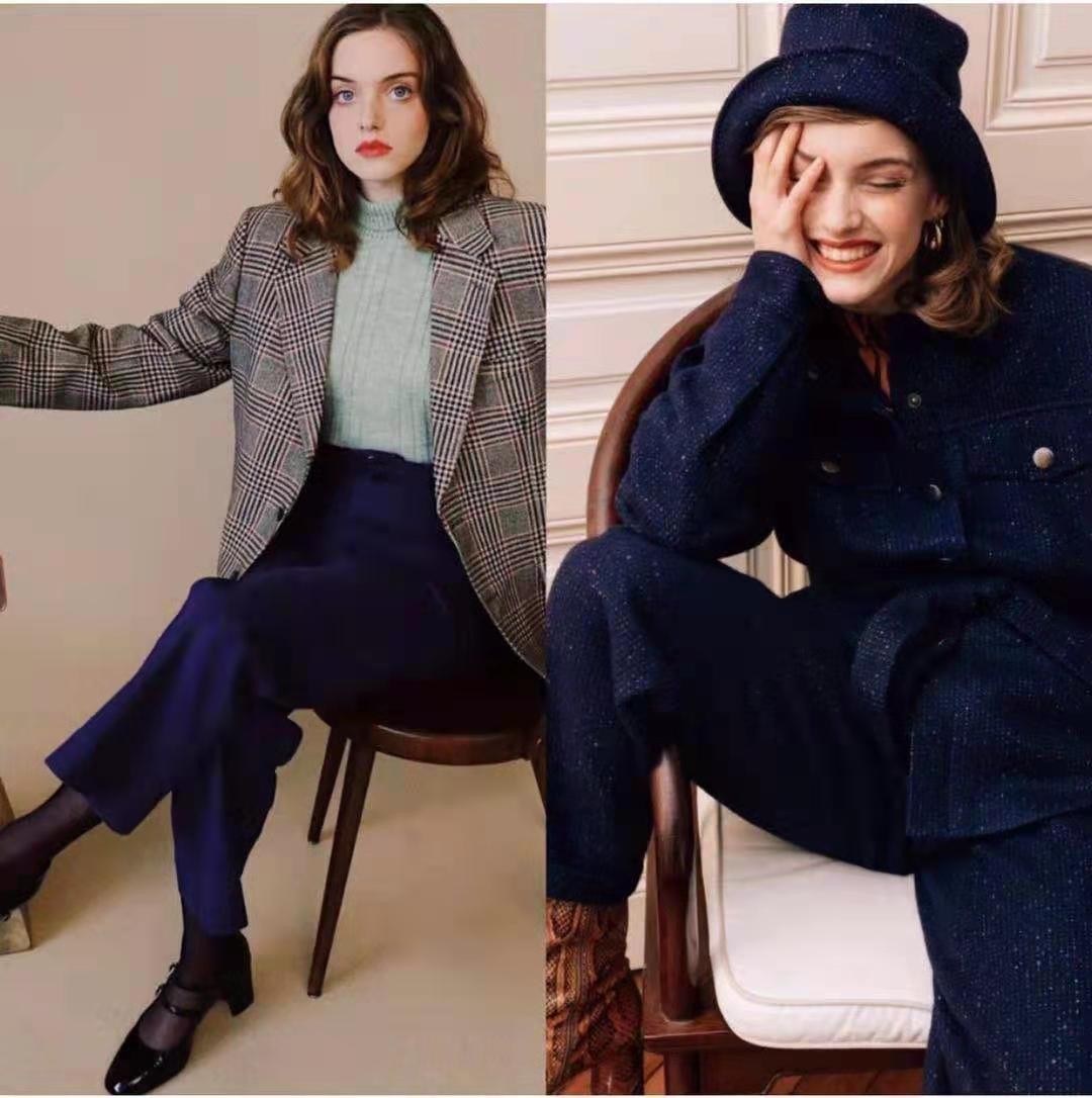 帶有格紋元素的西裝搭配深藍色的西裝褲,有一種英倫的帥氣紳士風格,更加日常搭配,很有職場的氣息。套裝的搭配也非常符合現代女性的審美,深藍色帶有亮亮的點綴,有一種女生的氣息,又有中性的帥氣。