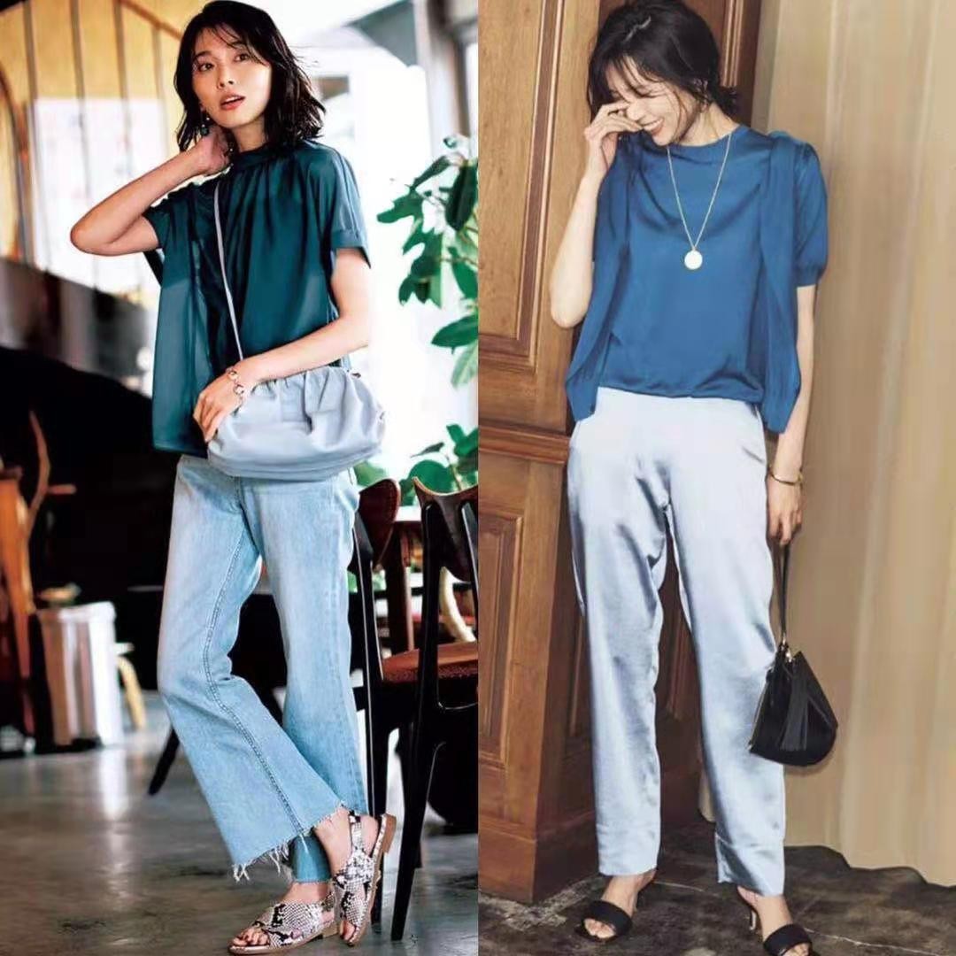 這兩身衣服都屬於一個深色的衣服加上淺色的長褲,但是搭配的包包卻不太一樣。左邊是一個背帶型霧霾藍色包包,剛好與下身淺色牛仔褲相呼應。而左邊的黑色手提包與褲子色形成反差,但跟鞋子顏色呼應,讓整體看起來更協調。
