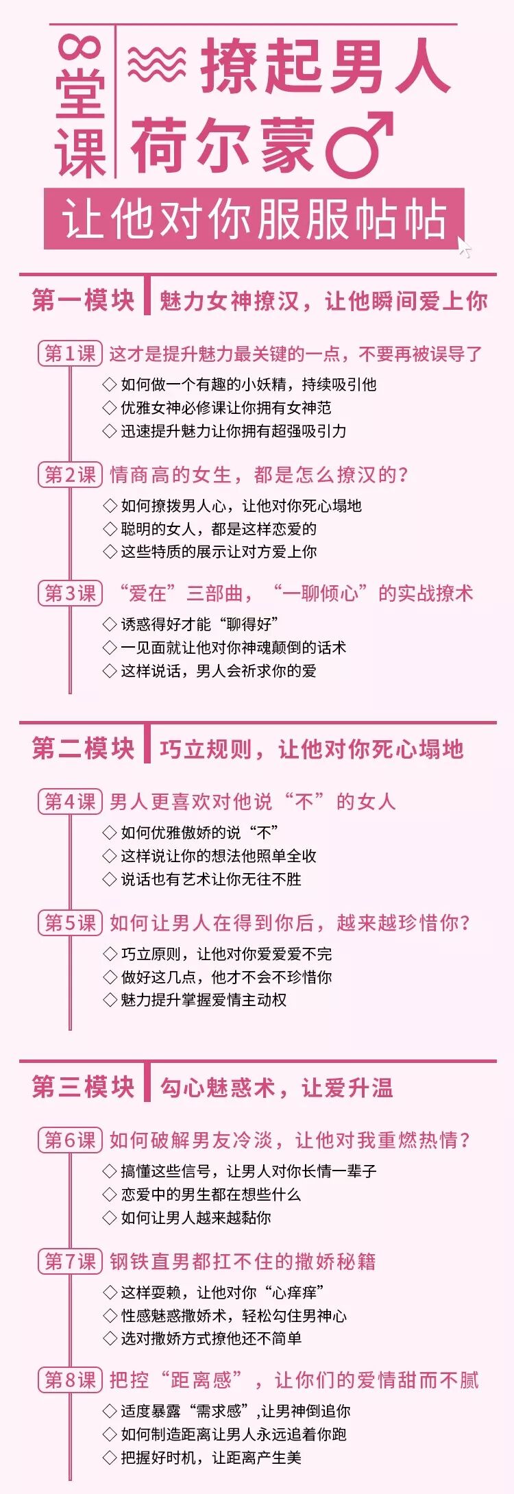 推出了這門共有30個核心知識點的課程,《8堂課撩起男人的荷爾蒙,讓他對你服服帖帖》