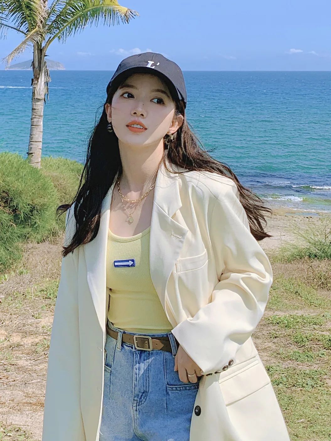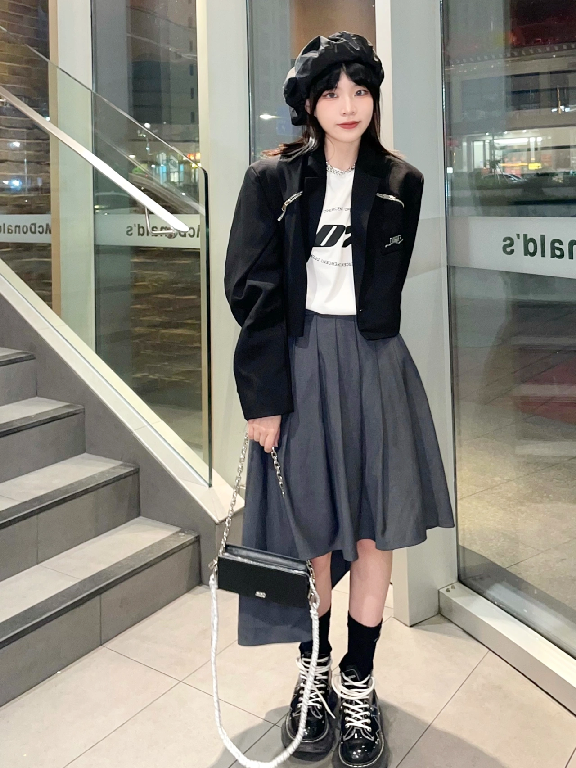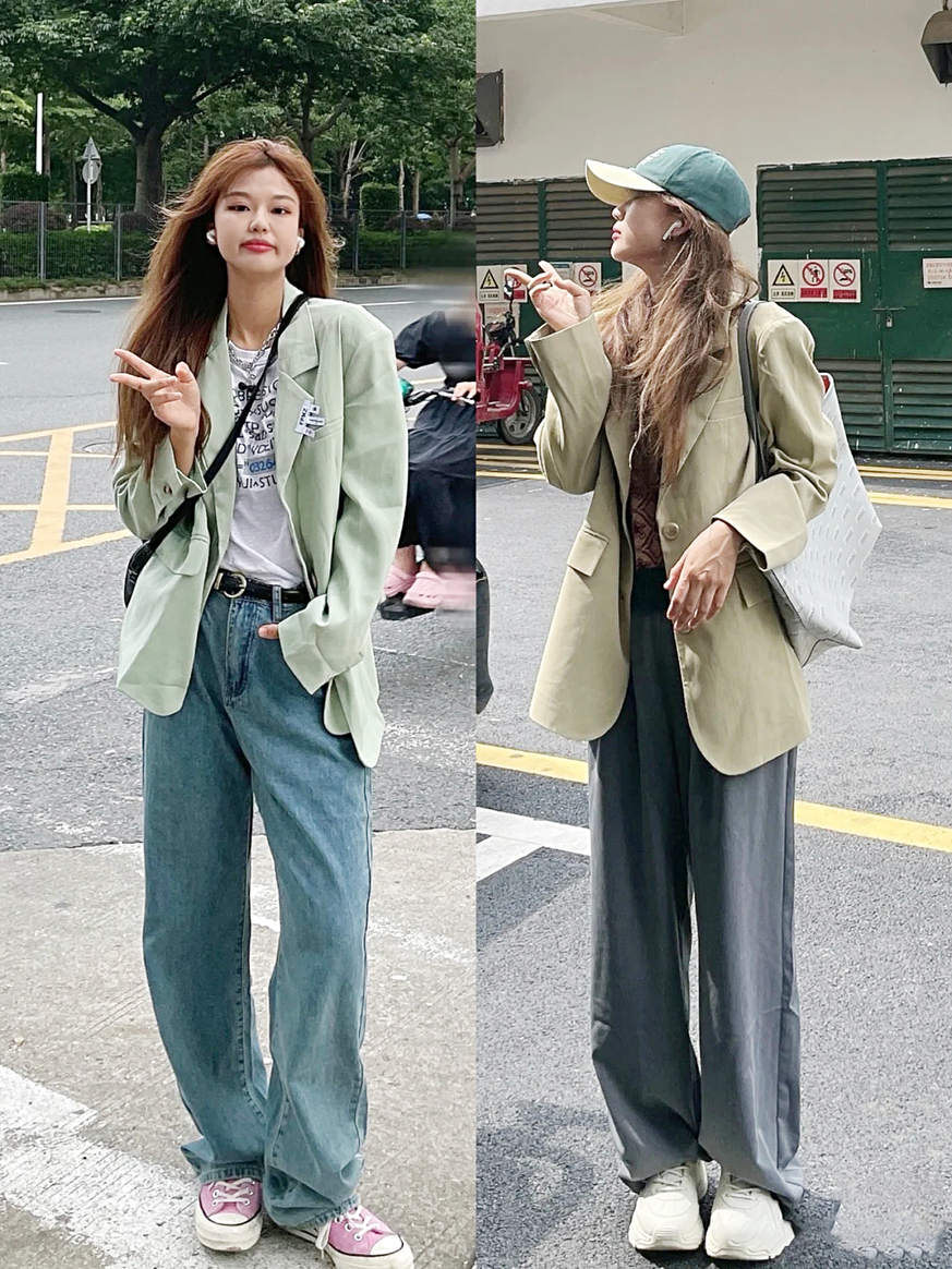很多姐妹擔心穿西裝後會變老氣,其實內搭T恤就好了,保留了學生氣同時也不會覺得太熱。
